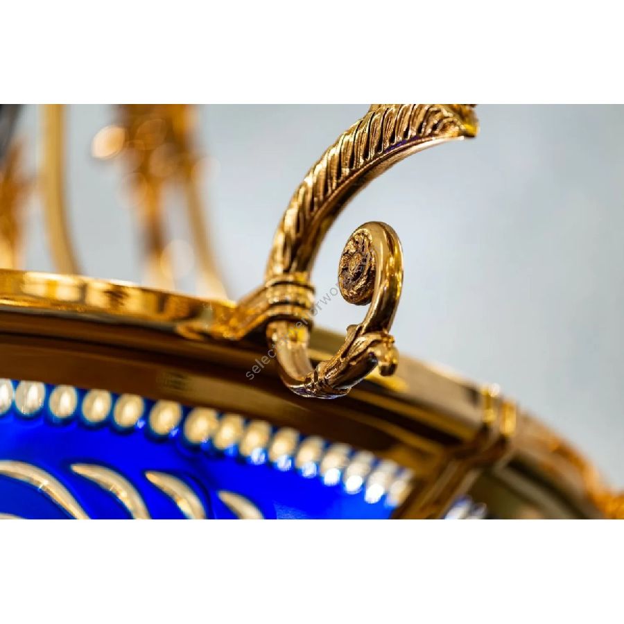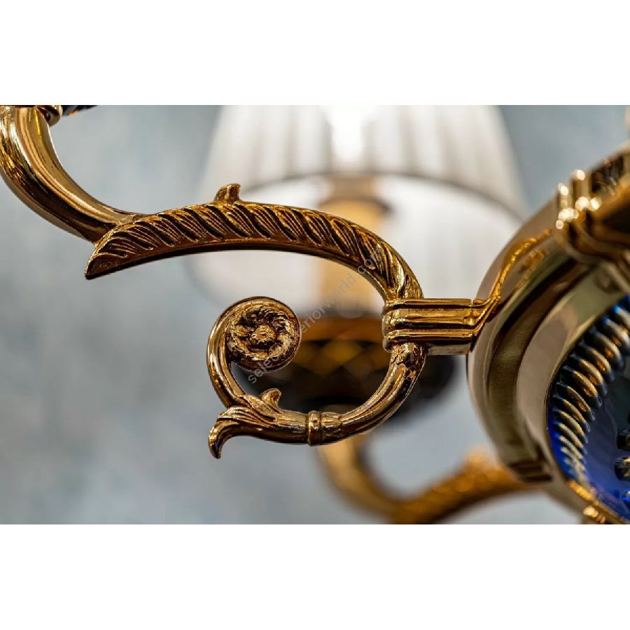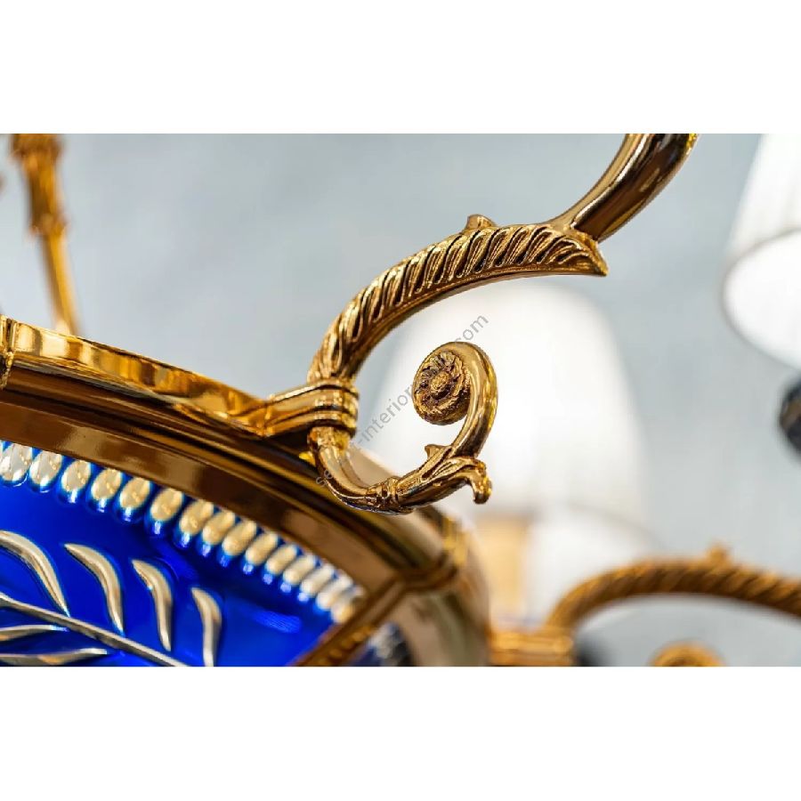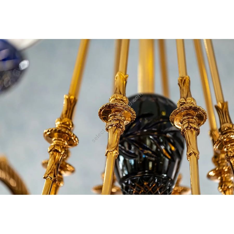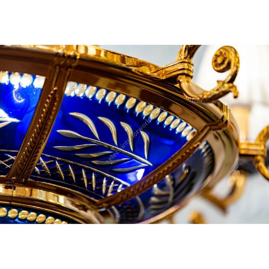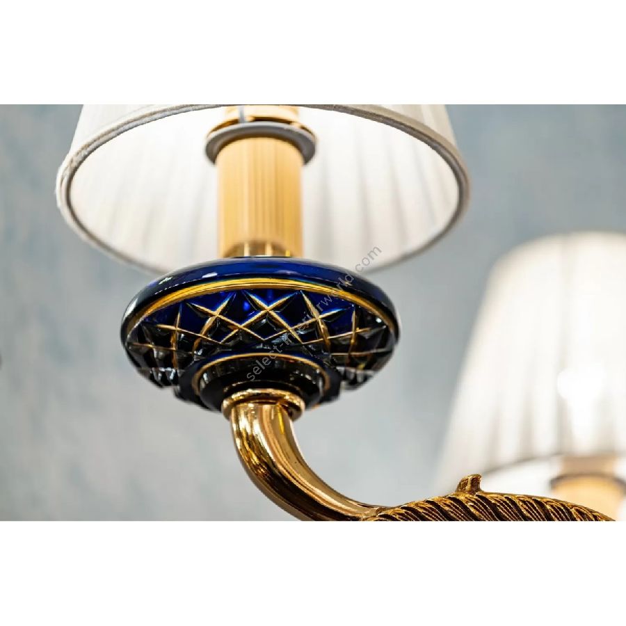This collection is the most elegant and luxurious version of the Raffaello collection. The panels here are in hand cut crystal in amber and blue / amber colors, and the arms are further completed by pleated organza lampshades in a delicate ivory color. The elegant finish of the brass parts is made of Shaded Gold. Chandeliers, wall lamps and table lamps complete the collection. Possibility to customize the finishes