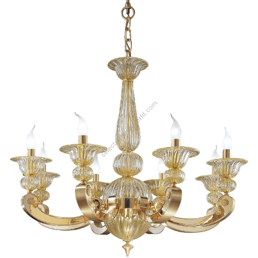 Amy is a collection of brass chandeliers and wall lamps where the alternation of the glossy and opaque parts is due to the precious satin Gold / Pure Gold finish and where the glass is embellished with golden specks enclosed inside. The vases made with glass with gold complete this collection. Customizable in finishes and sizes