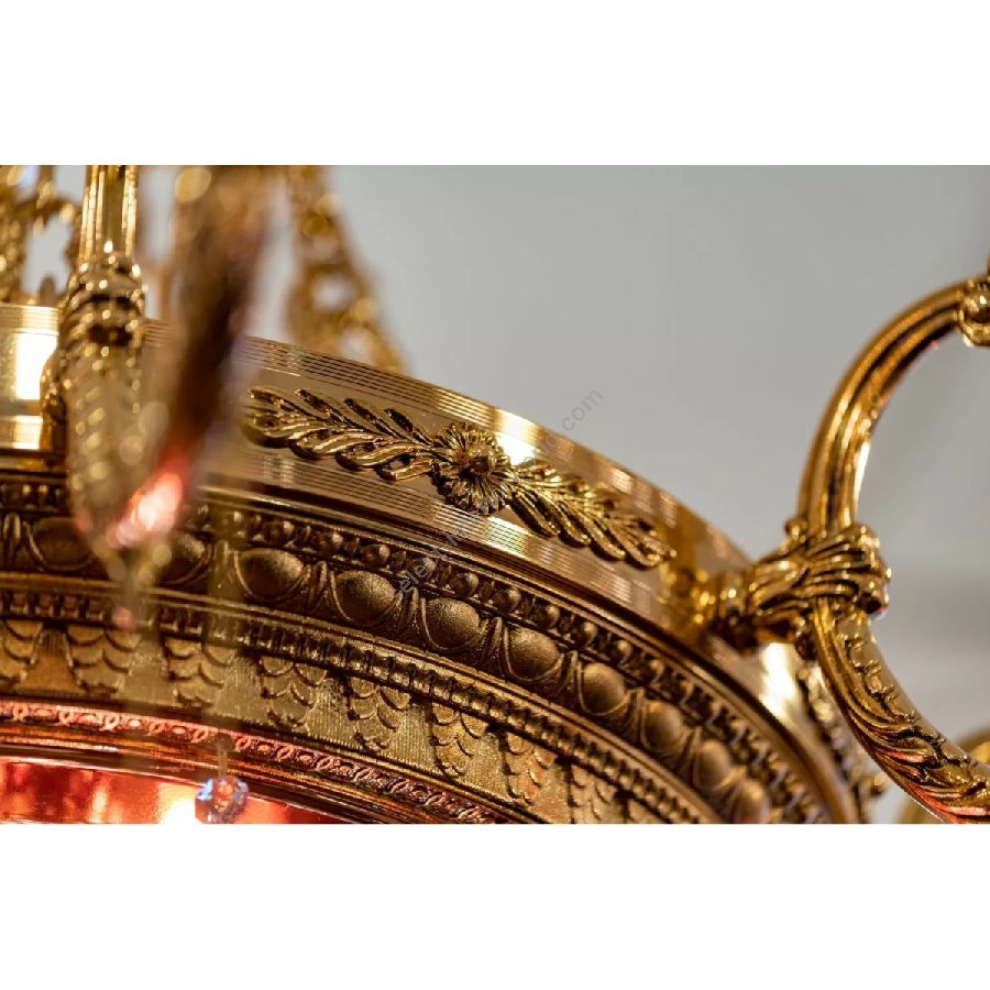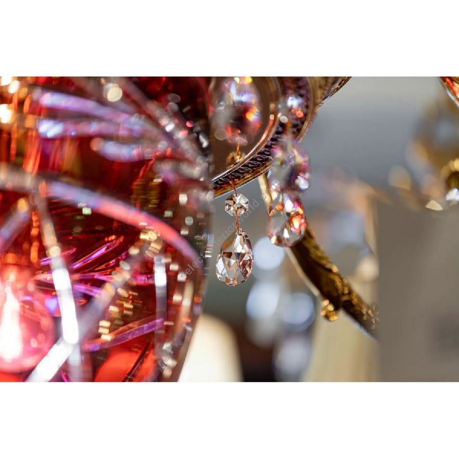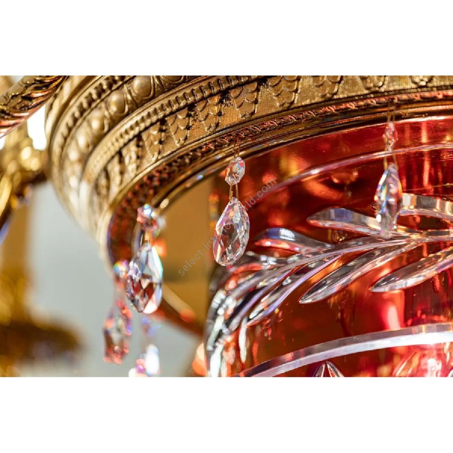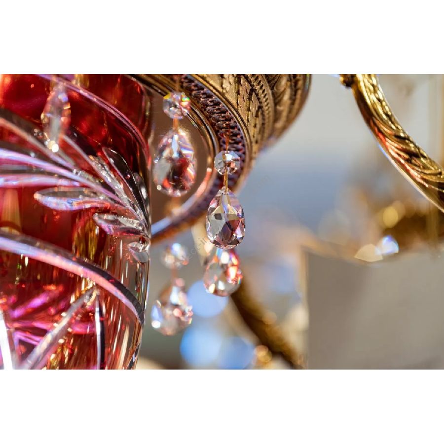 The suspensions and ceiling lights in shaded pure gold give life to the Edgard collection. Machined brass combined with important crystal cups available in amber, red or transparent colors are enriched with small drops in Schoeler crystal. All the models can be combined with the brass and crystal wall light.