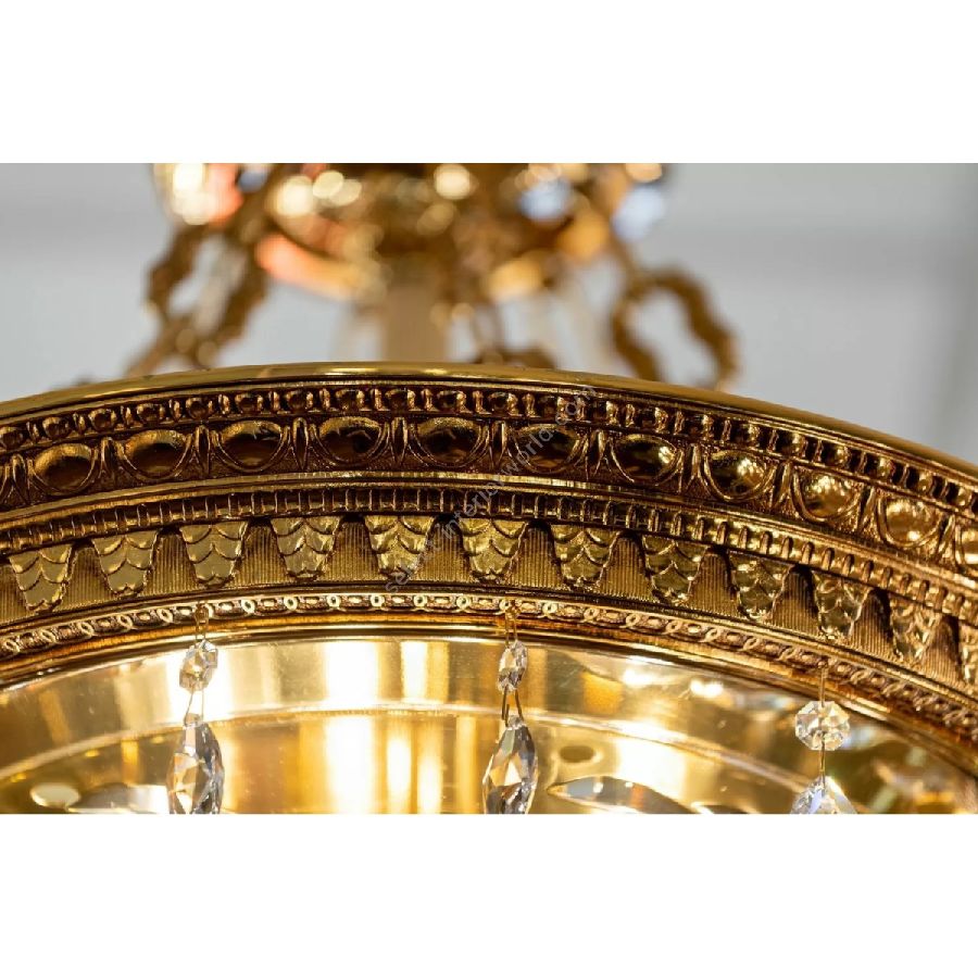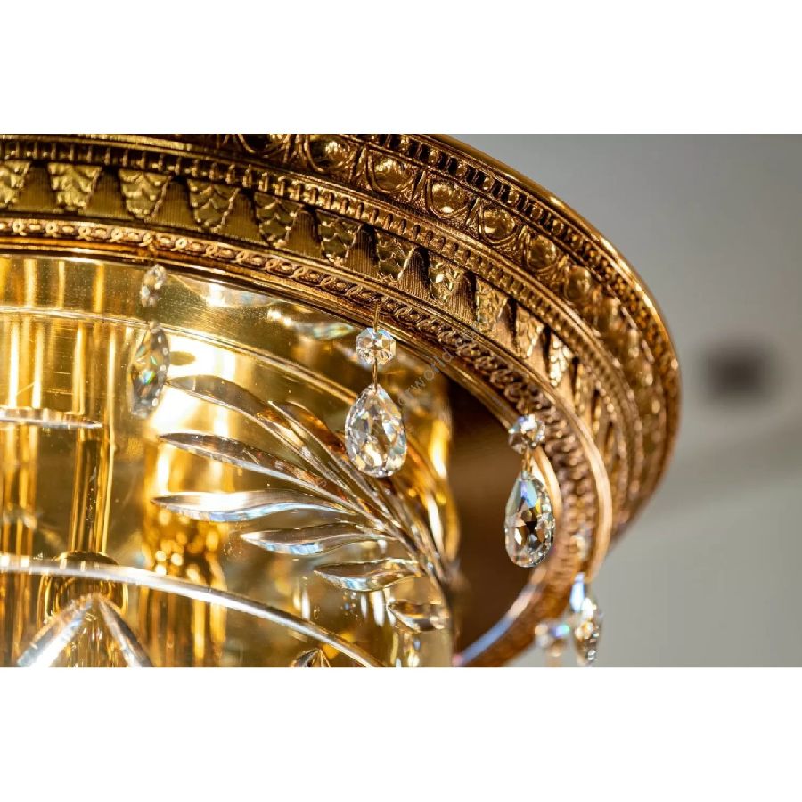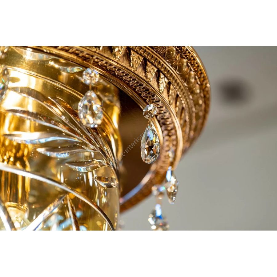 The suspensions and ceiling lights in shaded pure gold give life to the Edgard collection. Machined brass combined with important crystal cups available in amber, red or transparent colors are enriched with small drops in Schoeler crystal. All the models can be combined with the brass and crystal wall light.