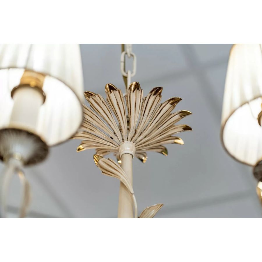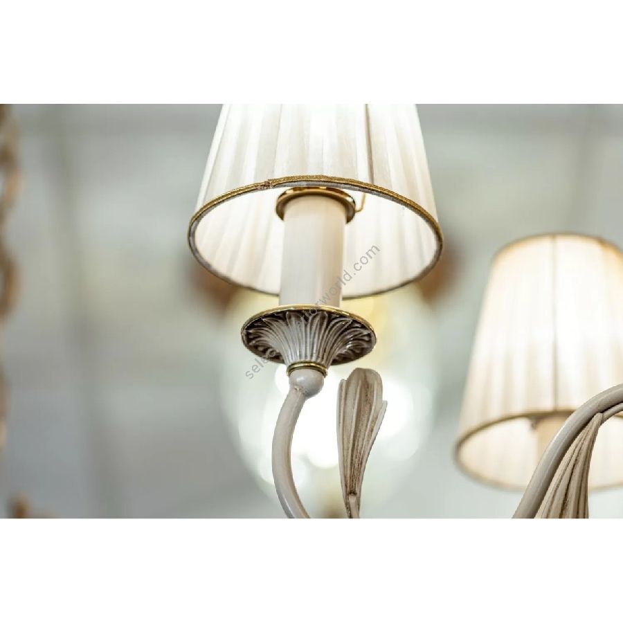 This delightful collection made up of chandeliers, wall lamps and table lamps has a constant decorative element in the shape of a leaf that enriches the arms and the central column and the particular Antique White and Gold finish enhances the details. The combination with organza lampshades in cream color makes it very sophisticated and elegant. Customizable in finishes and sizes.