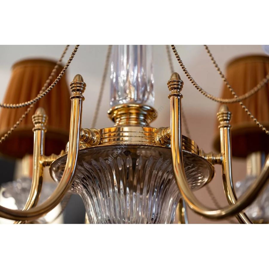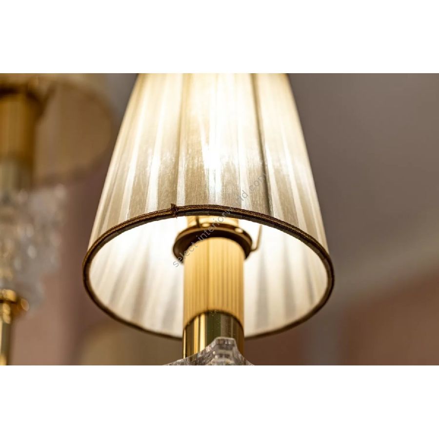 This refined and elegant collection of chandeliers, applique table and floor lamps is the perfect combination of subtle and elegant brass and crystal with slender shapes. The lampshades that complete it can be in cream organza or in shantung. Customizable in finishes and sizes.