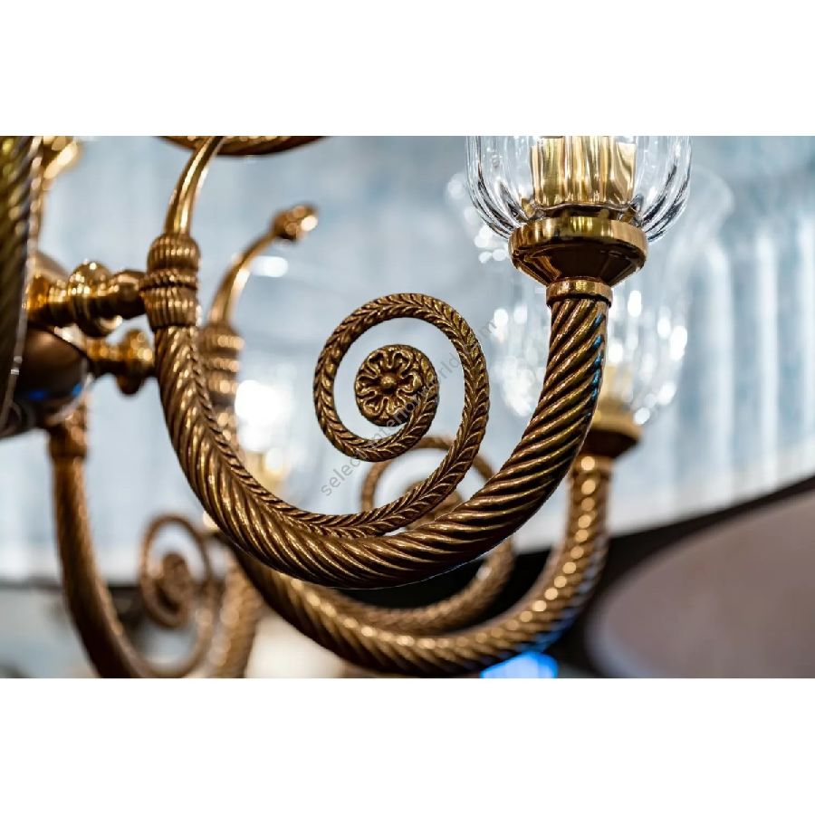 In the chandelier, the reference to the natural elements is given by the hand-made transparent crystal leaves, which form the central part, the finish can be in French or Satin Gold, and the diffusers on the arms are in crystal. Customizable in finishes and sizes.