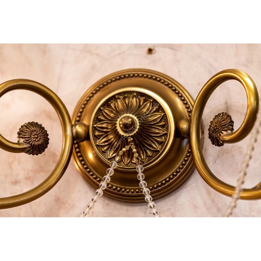 Brass collection in antique French gold finish with crystal drops supported by small daisies, in transparent Schoeler crystal as well, with dove taupe color lampshades. Chandelier and wall lamp can be customized in finishes and sizes.