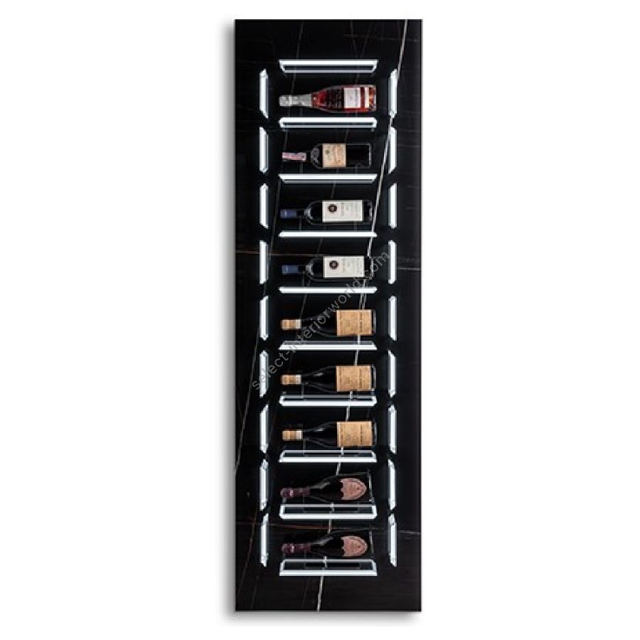 Luminous bookcase made up of a panel in MarmoReflex or LegnoReflex and backlit glass shelves with a prismatic shape. Possibility of having stainless steel bottle holders to transform the luminous bookcase into a wine cellar.