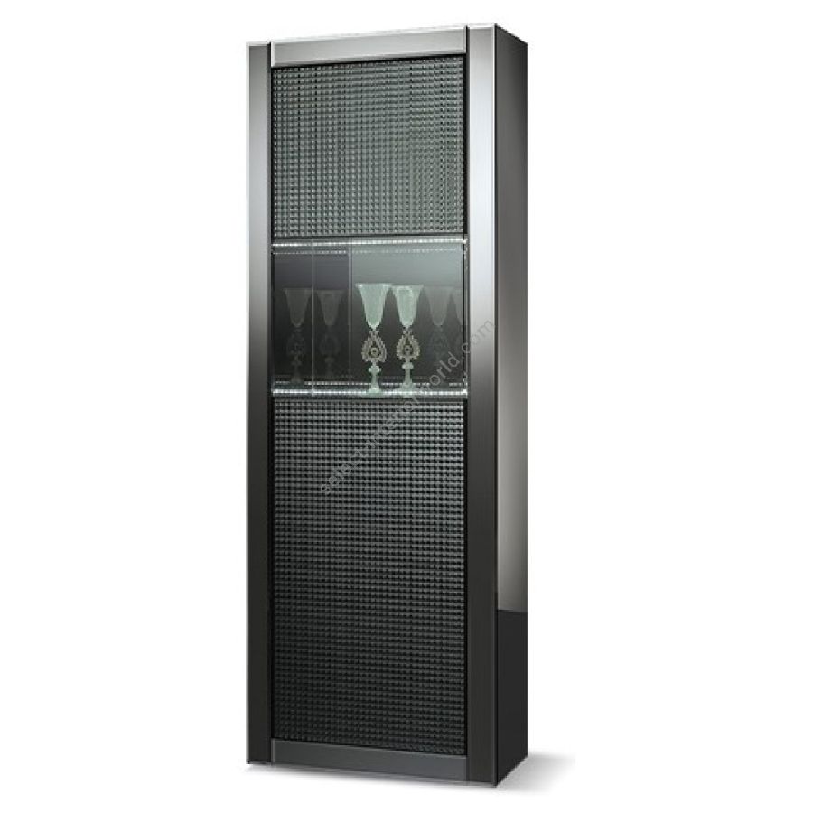 Modular unit available in shiny lacquered finish with application of bevelled lacquered glass on the fronts and door in transparent glass with Diamante engravings and central space in gold leaf finish. Alternative finish in shiny lacquered nero beluga colour with application of bevelled smoked mirror glass and door in smoked mirror with Diamante engravings and central space in mirror.
