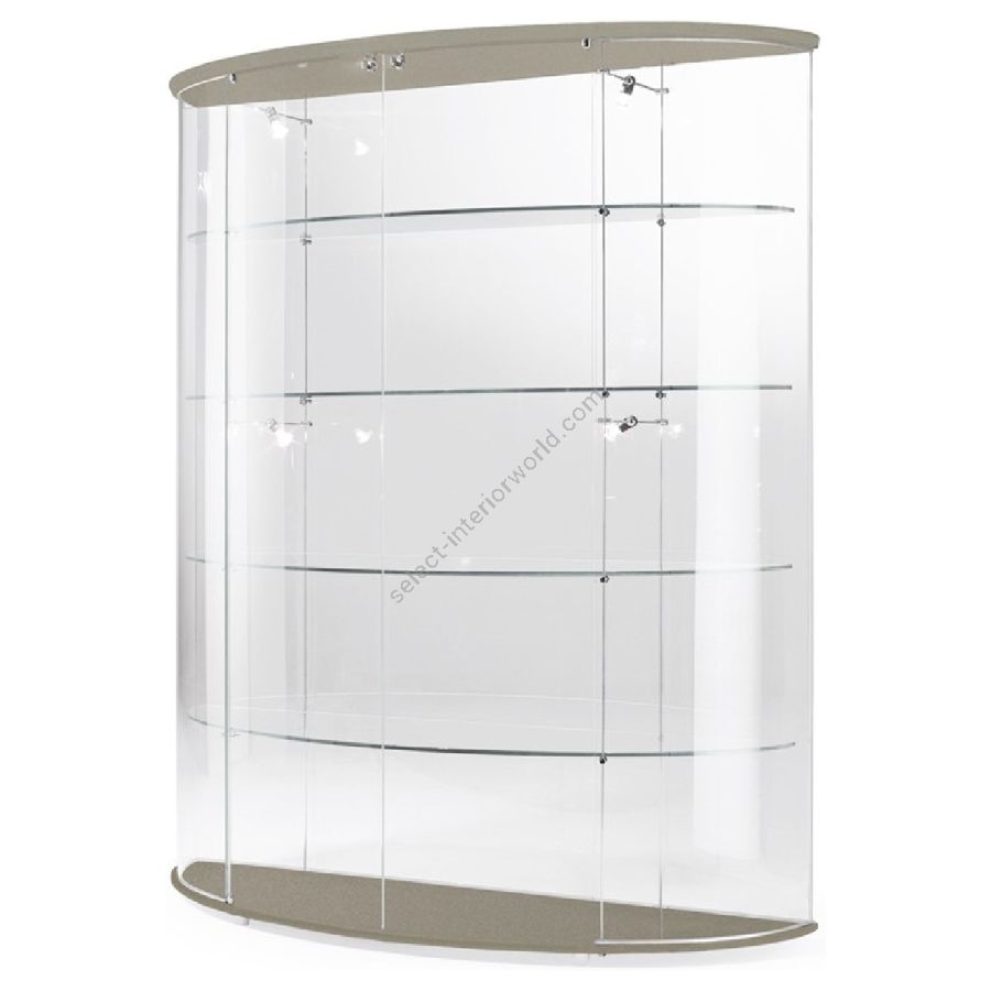 Display cabinet available with wooden base and top in matt or shiny black or white lacquered finish, walnut or wengé or with base in white or black lacquered glass and top in transparent glass. Curved transparent glass doors with lock, adjustable shelves and optional lighting system.