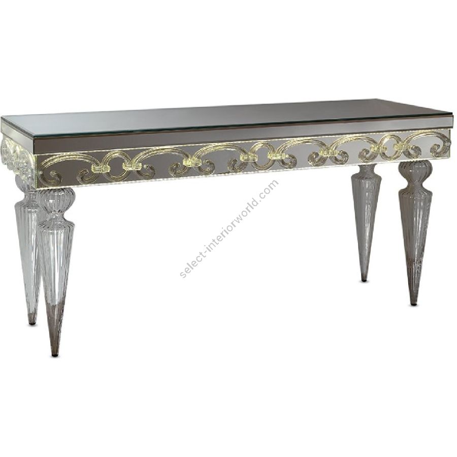 Console with structure in wood covered with extraclear mirror. Transparent or gold Murano glass decorations with optional LED lighting. Legs in ribbed Murano glass, transparent or gold