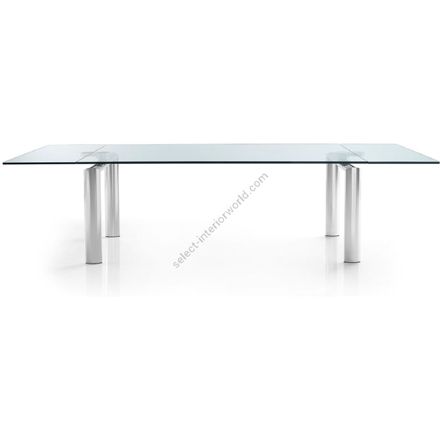 Extendable dining table. Top and extensions 15 mm thick in glass, extra-clear glass, Marmoreflex/Legnoreflex Legs: round section in brushed steel; oval section in bronze, satin brass, dark brass or titanium finish or in shiny chrome: curved glass 24 mm thick or 19mm thick extra-clear glass.