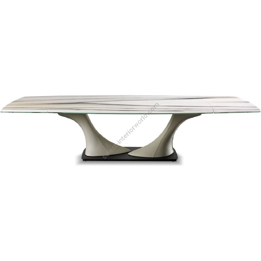 Extendable dining table, available with 1 extension and single base or with double base with 2 extensions. Legs covered with leather Naturale or Nabuk. Metal plinth in Bronze (100M or in the satin brass or titanium finishes. Top in Marmoreflex/Legnoreflex glass