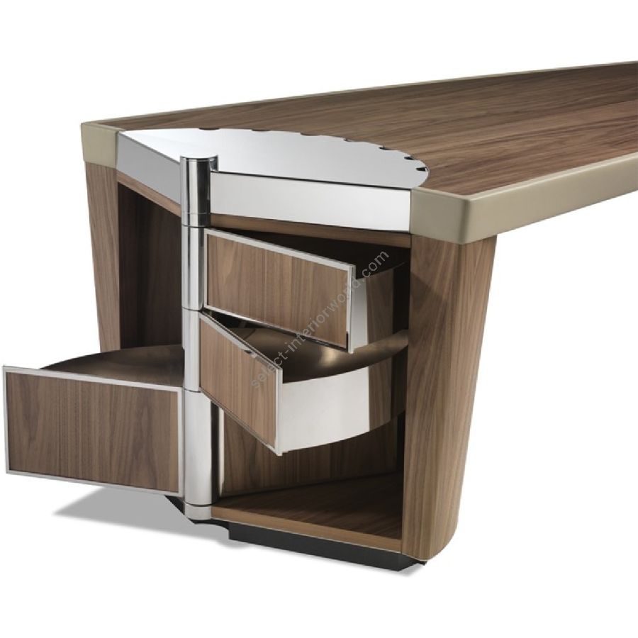Desk with structure in Canaletto walnut or in shiny ebony wood and top-edge covered in leather. Top available in Canaletto walnut, shiny ebony wood or in Marmoreflex/Legnoreflexc glass. Equipped with compartment for plugs and connections and unit with drawer and filing-drawer with edges and details in steel. Available with leg in black or pearl-grey Murano glass (A model) or with swivel drawer’s unit (B model)
