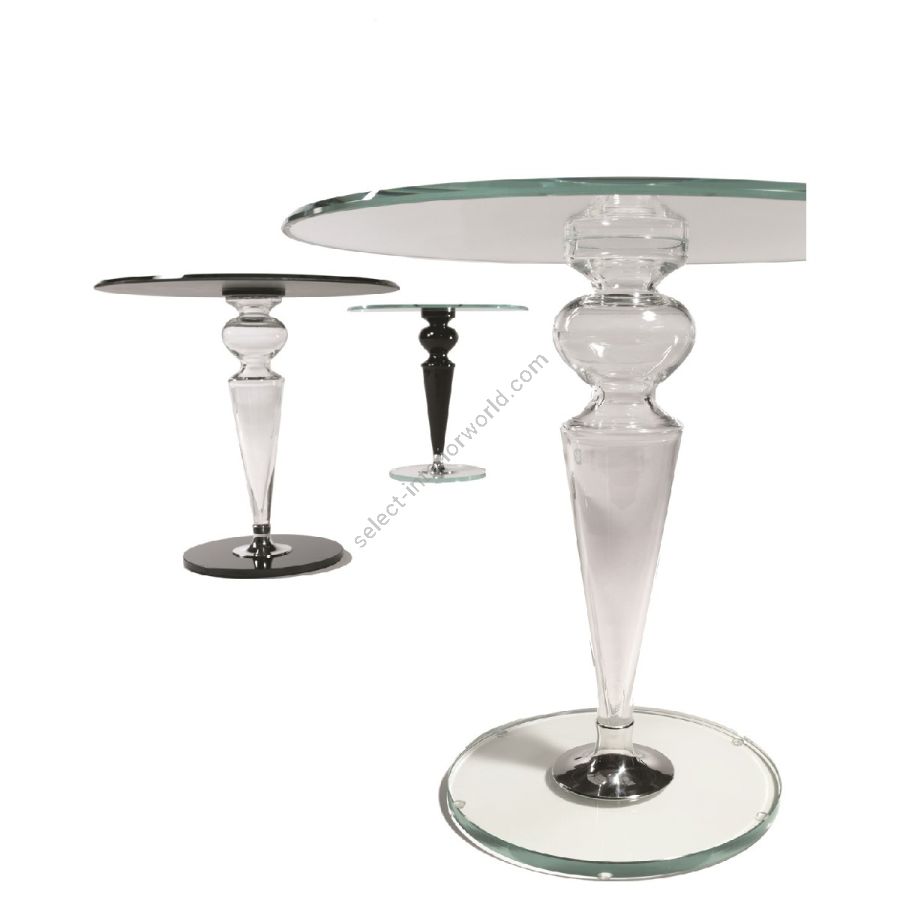 Side table with leg in smooth Murano glass transparent or in colors black, blue-gray, red, amber, amethyst, tobacco colours. Leg also available in ribbed transparent or gold Murano glass. Base in transparent, black lacquered or mirror glass. 10mm thick transparent glass top.
