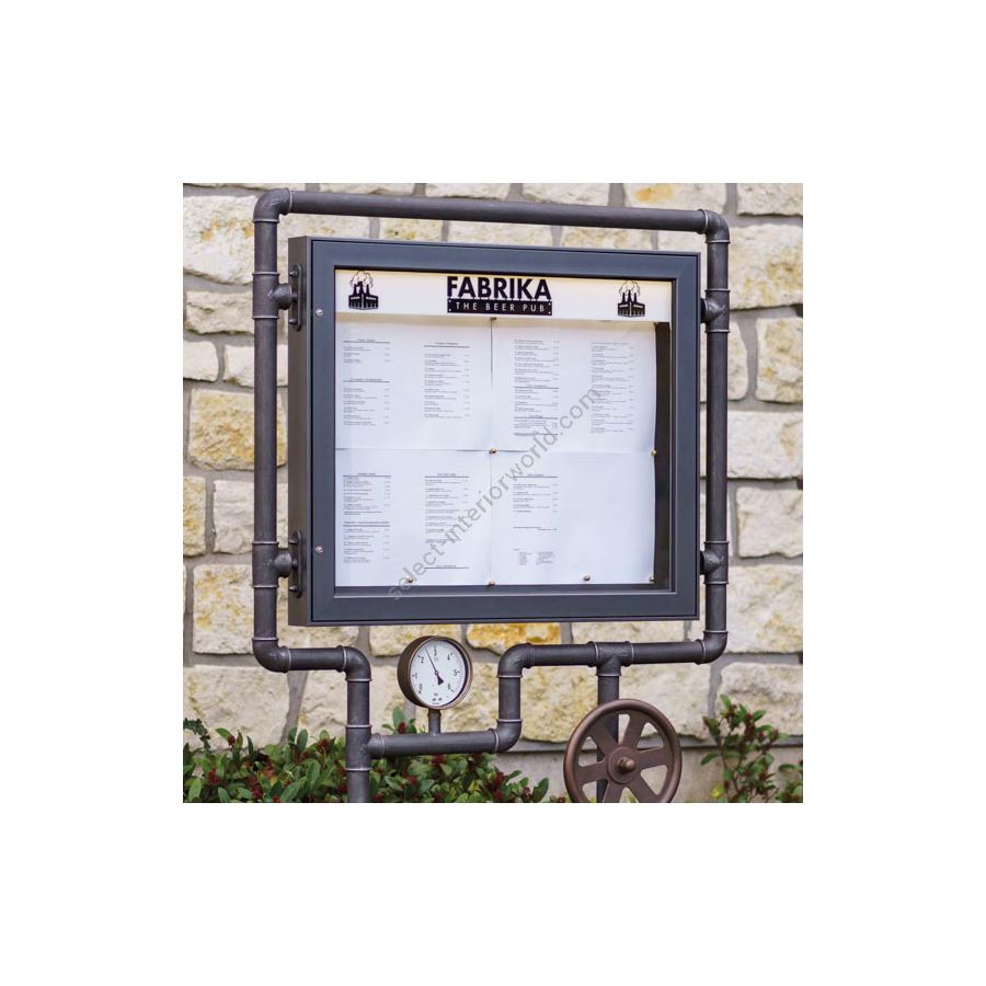 The industrial menue box is equipped with LED light, safety glass, two security locks and a translucent white acrylic stripe for your individual logo. We added some special elements to create an authentic industrial look.