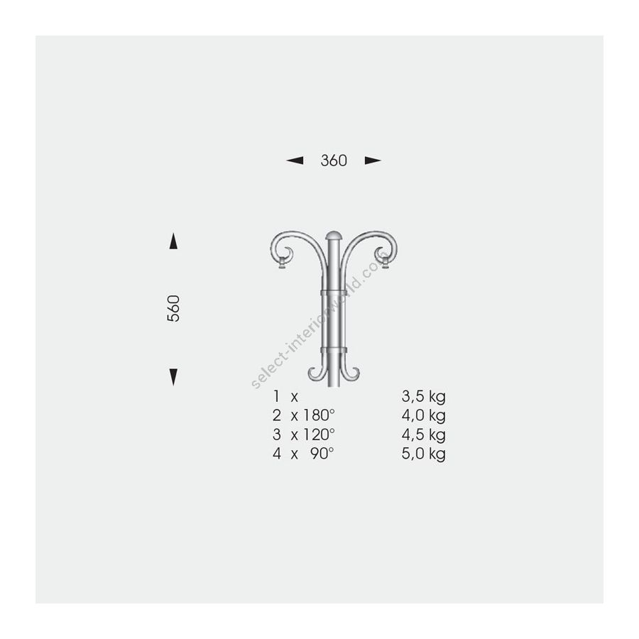 This post lamp by Robers (Germany) is combining Classic and Medieval styles in one design. It is distinguished by the solution for the shades and their holders with the hook-look. Each of three lanterns has a cylindrical shape with panes tinted into the antique finish and covered by a cone-shaped roof with a ventilator cap. The column is ornated by carving in its lower part. The upper pole looks massive, but still elegant supporting three arms for the lanterns. The fixture is handcrafted fully of wrought iron in 10 finishes chosen by the customer. It will look perfectly well in the garden or along the driveway.
