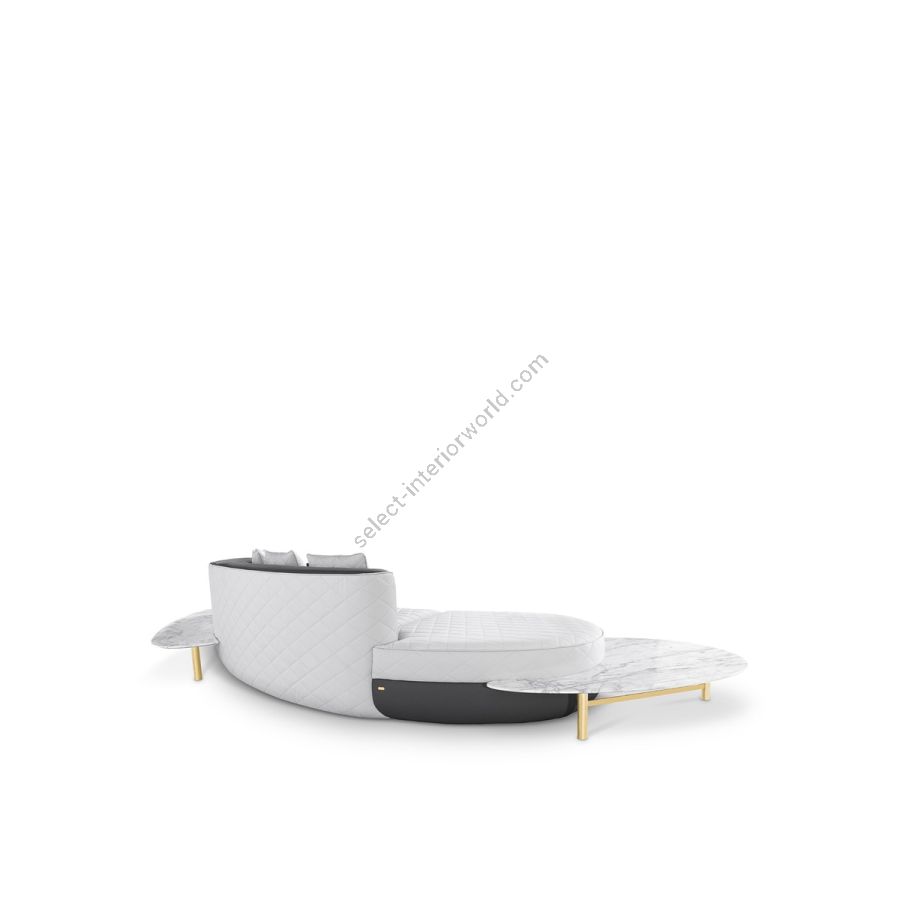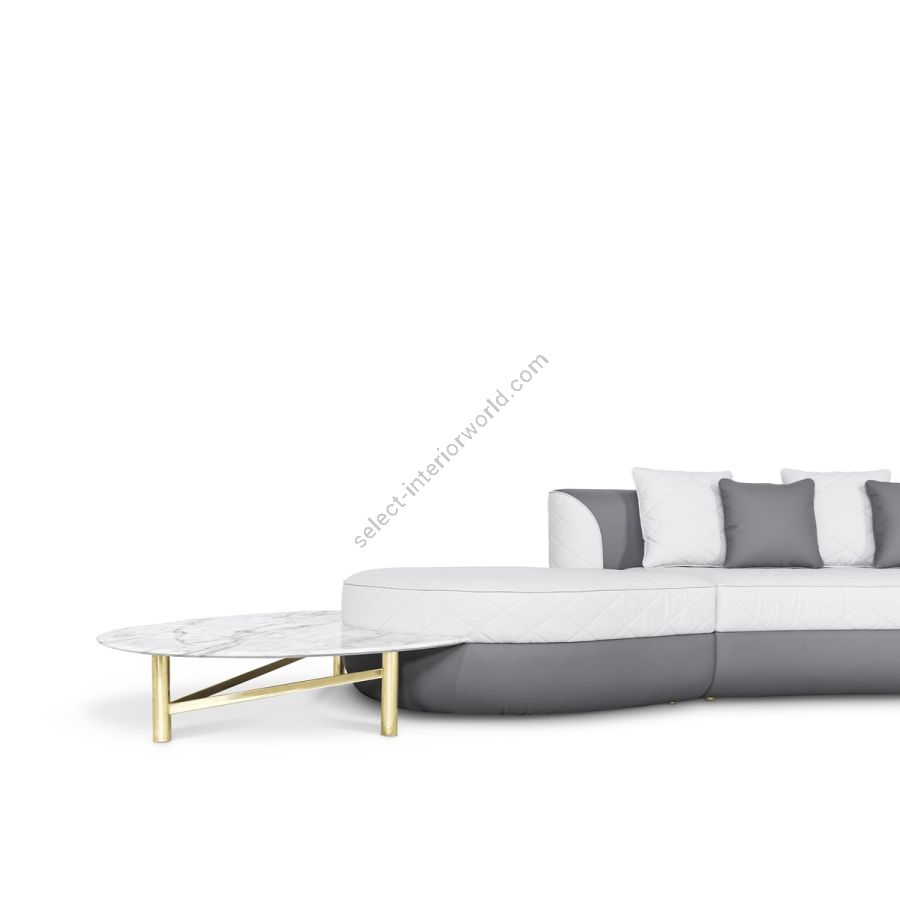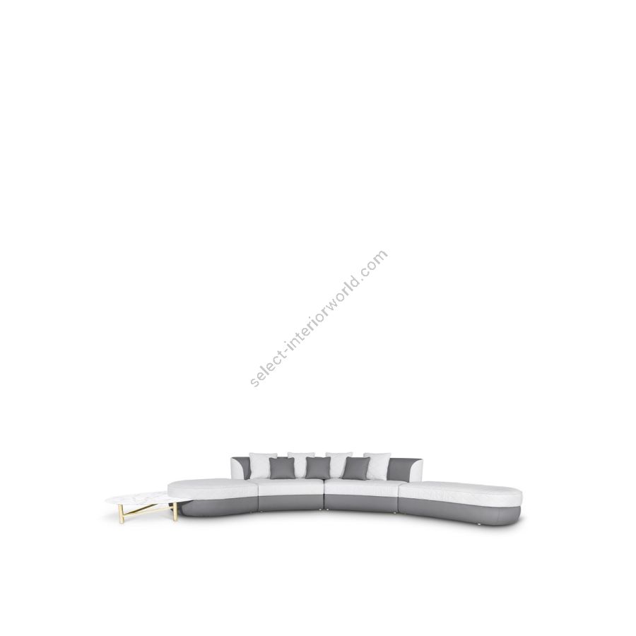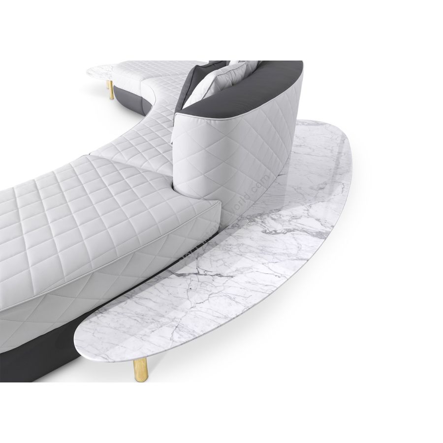The Senzu Sofa epitomizes comfort, functionality, and luxury with its round form, neutral color scheme, and leather upholstery. It features an integrated side table with a Carrara marble top and stainless steel base, adding a new dimension to your living room decor.