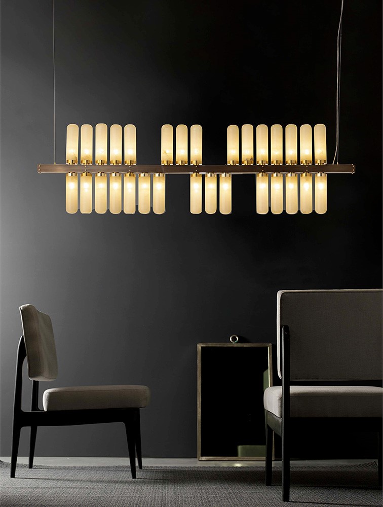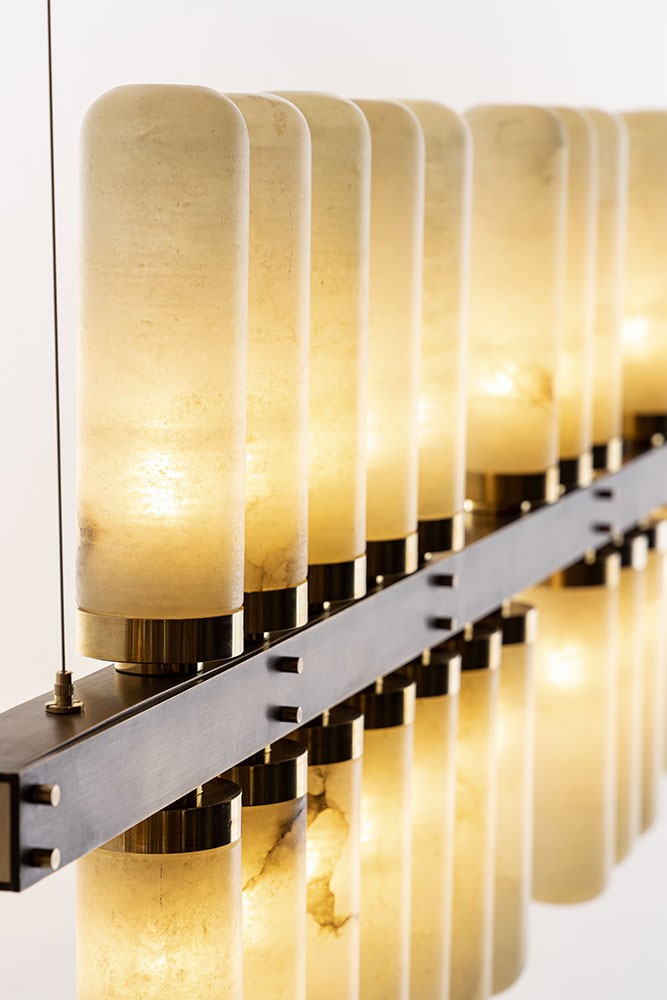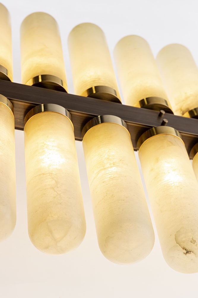 Chandelier horizontal shape in burnished brass and details in natural brass with alabaster