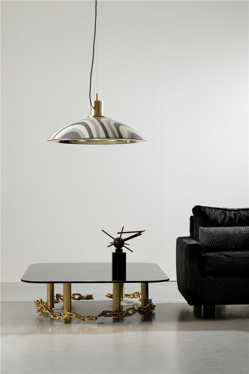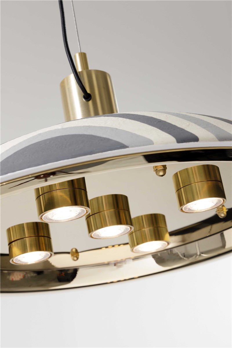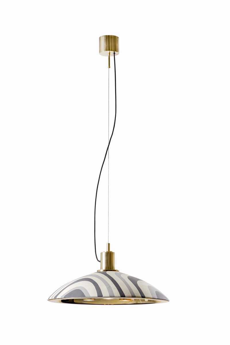 Hanging lamp in gilded brass details with hand decorated majolica plate in grey tones