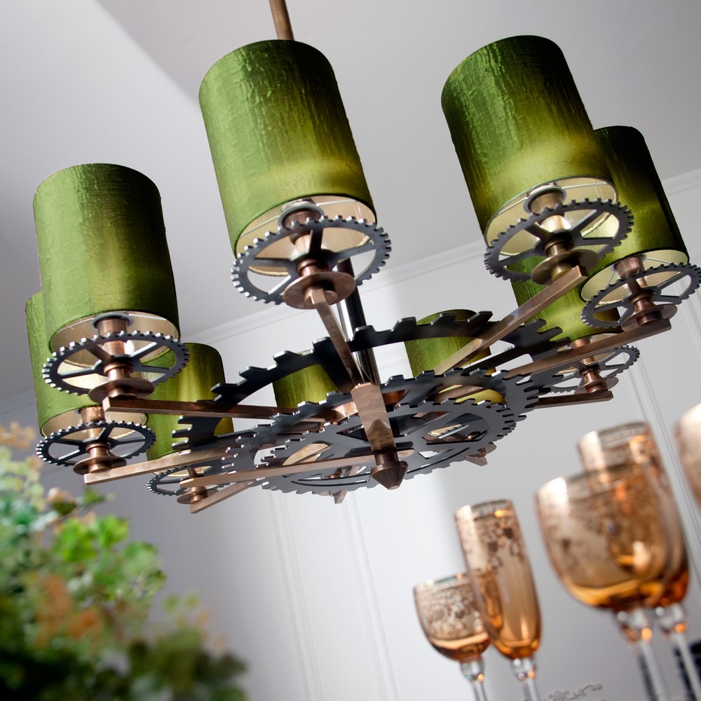Chandelier in burnished bronze finish. Pewter finish iron gearwheels. Green “lux” silk over green silk double lampshade.