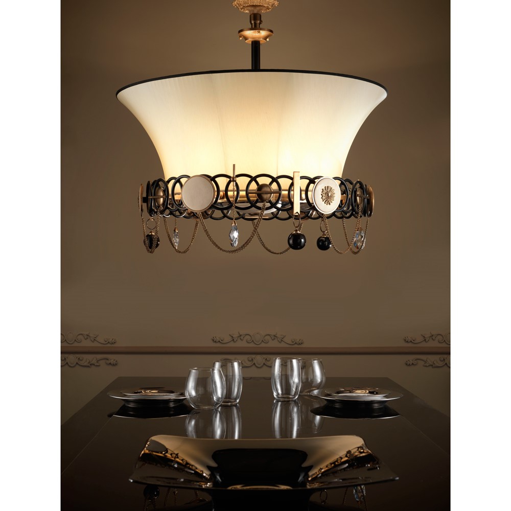 The central body of this chandelier is a fusion of burnished bronze and consists of a circular structure and a contrasting light shade. Its circular structure is characterized by hand-welded rings, enamelled in matt black and with the addition of brass details. The chains are in light burnished finish while the pendants are in crystal and glazed majolica in black. At the bottom of the chandelier is placed a black plexiglass disk. The lampshade is hand-sewn with a fine ivory silk and a black border. The precious finishes and size make it an ideal object to embellish living rooms and lounges.