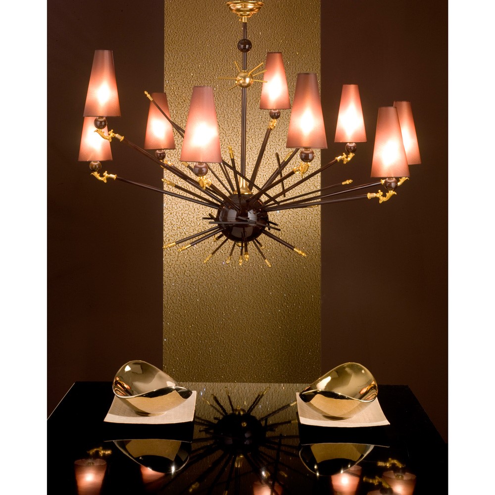 Chandelier with brown lacquered brass structure. Golden bronze details. Brown taffeta lampshade.