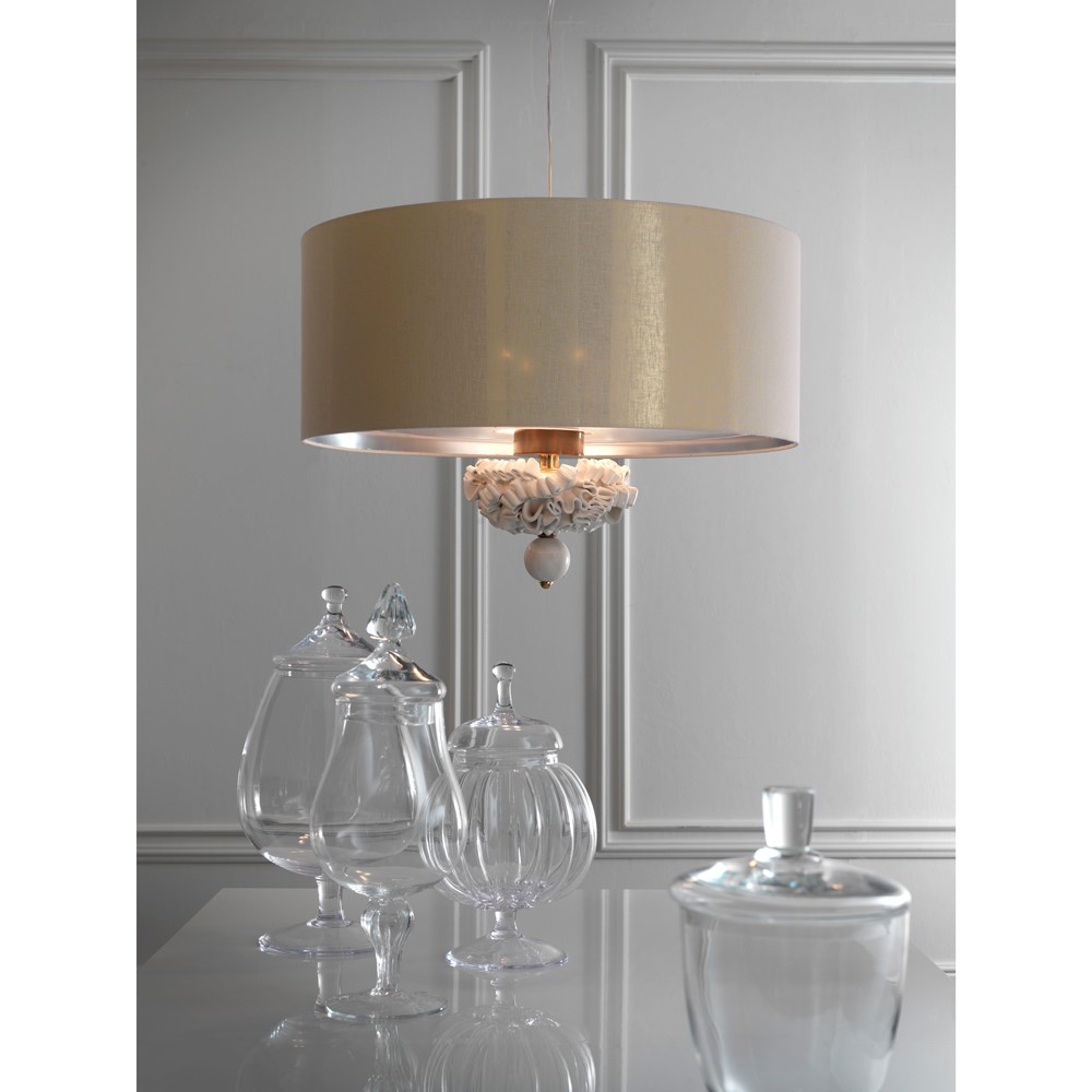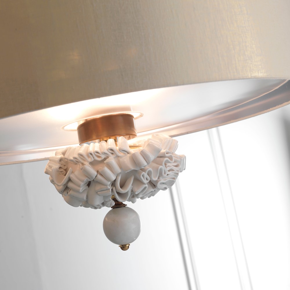 Chandelier with hand shaped majolica detail, hand glazed with burnished brass. White silk linen over gold lampshade.