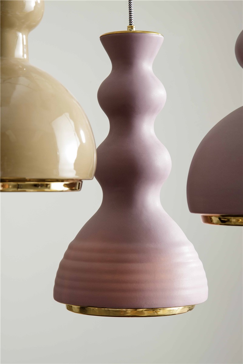 Suspension in glazed mayolica in mauve satin with brass details and gilded interior.