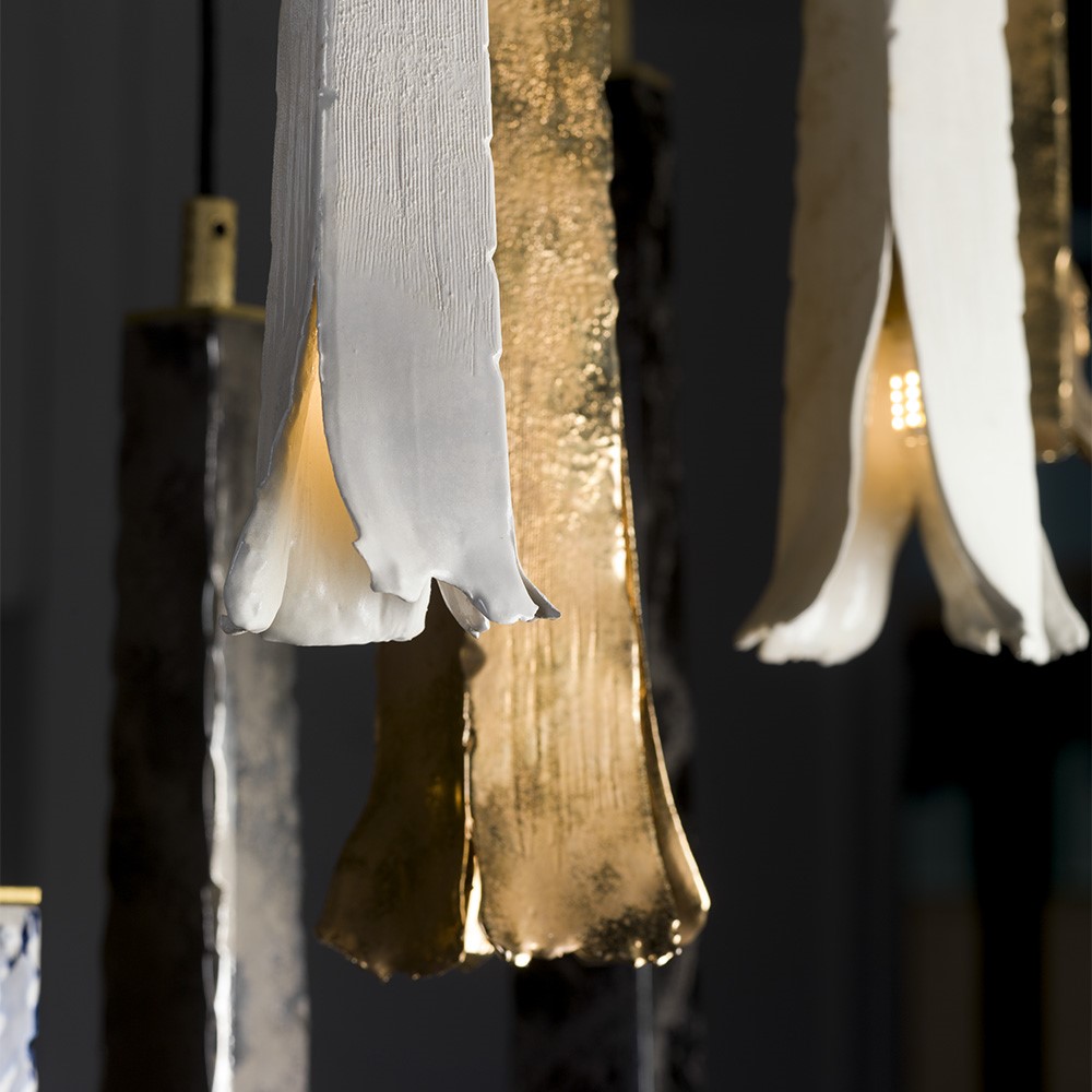 Majolica pendant in platinum with cup in natural satin brass.