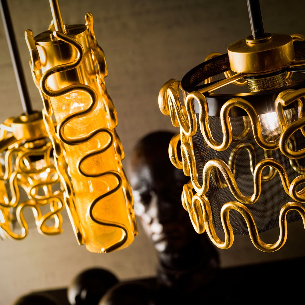 Series of hanging lamps in brass and bronze. Brass net lampshade. Matt gold finish. Matt burnished central shaft and lampshade.