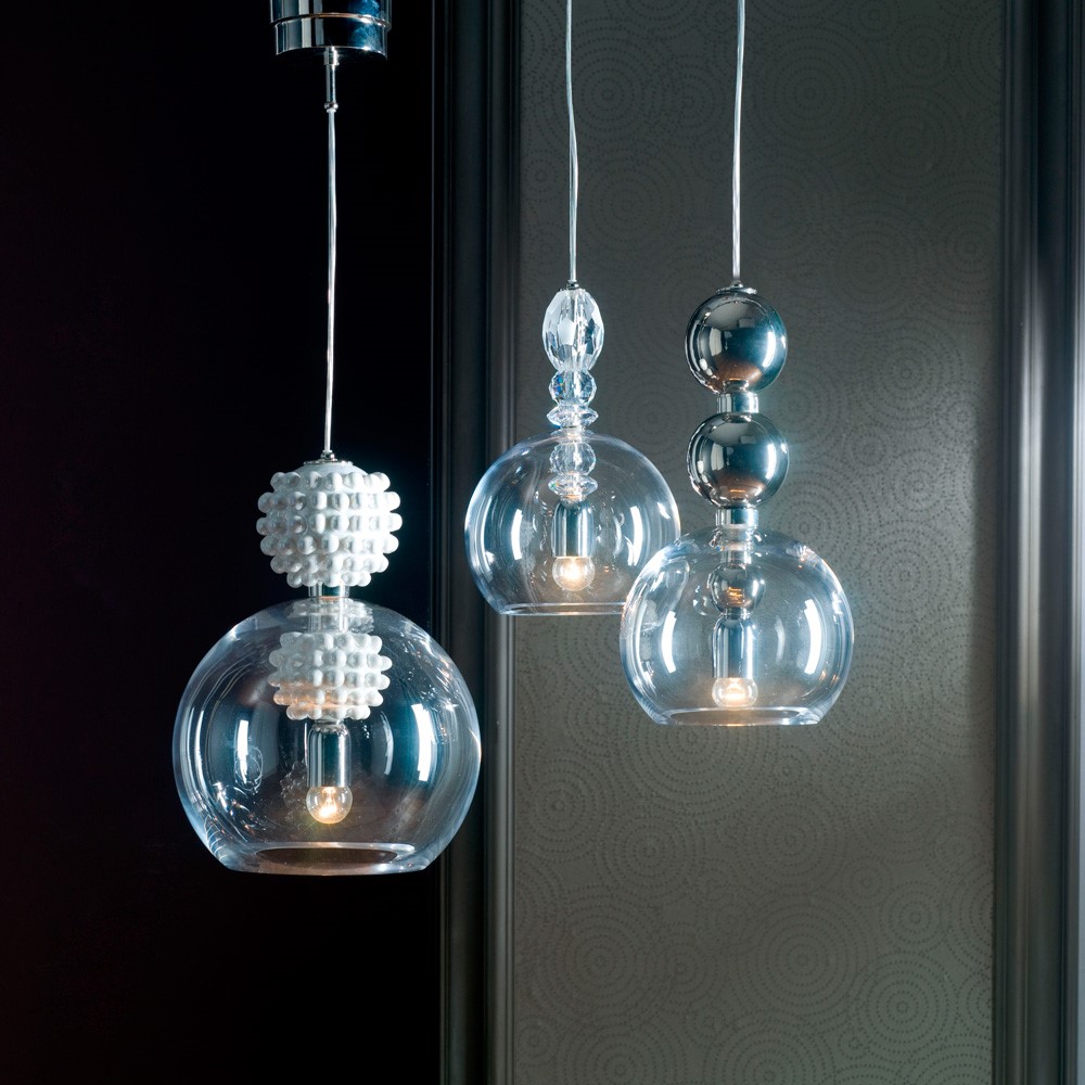 Pendant light with hand cut crystal sphere and crystals.
