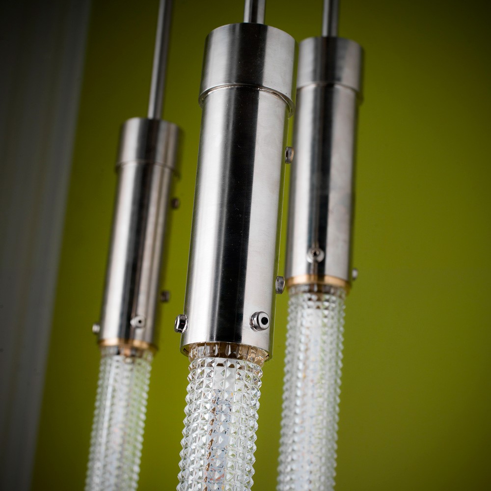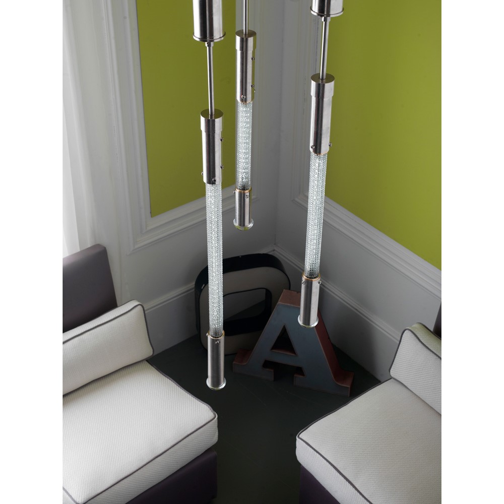 Brass pendant lamp with silver brushed finish. Hand cut crystal.