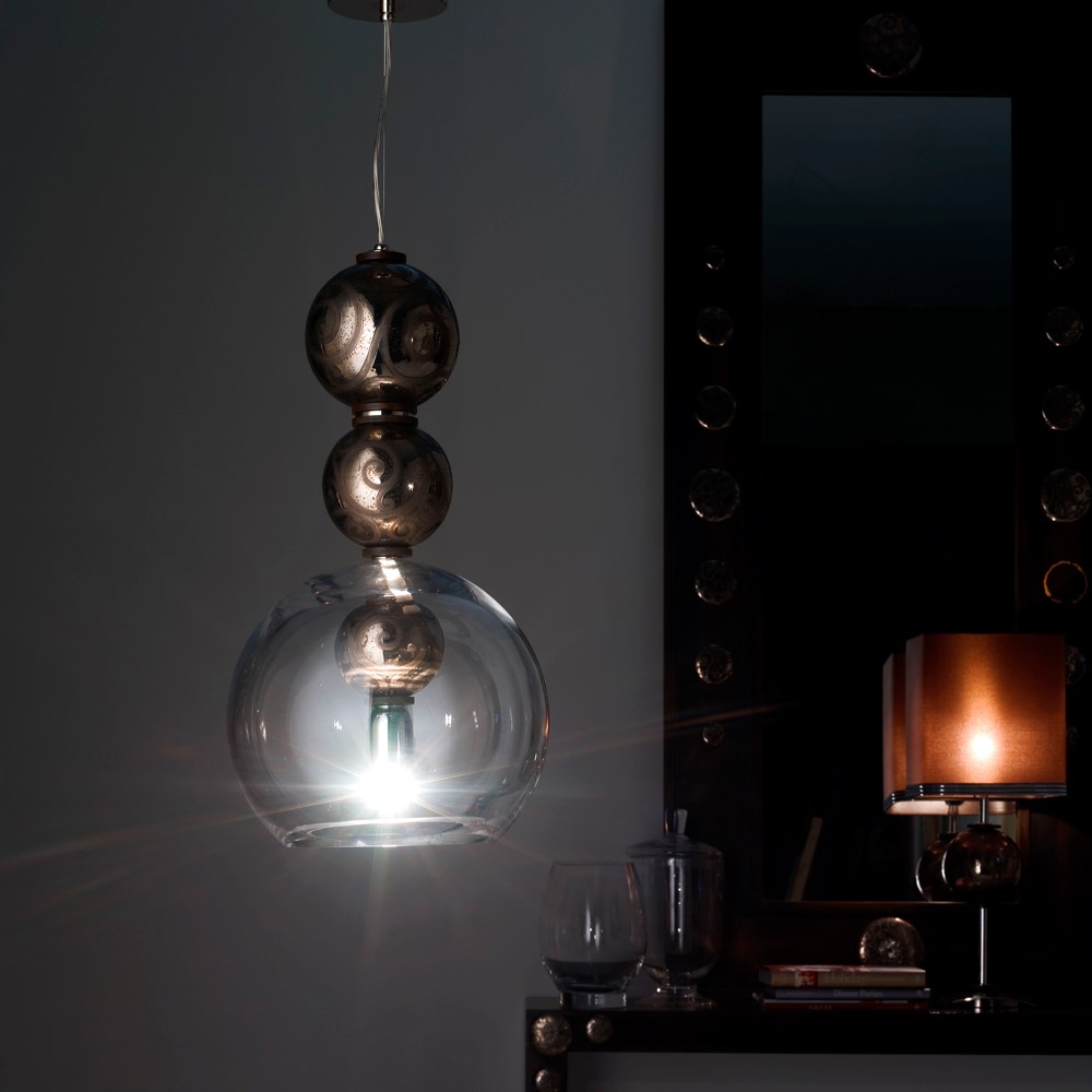Pendant light with crystal sphere. Details in platinum plated, hand decorated majolica. Chromed brass and dark brown wooden details.