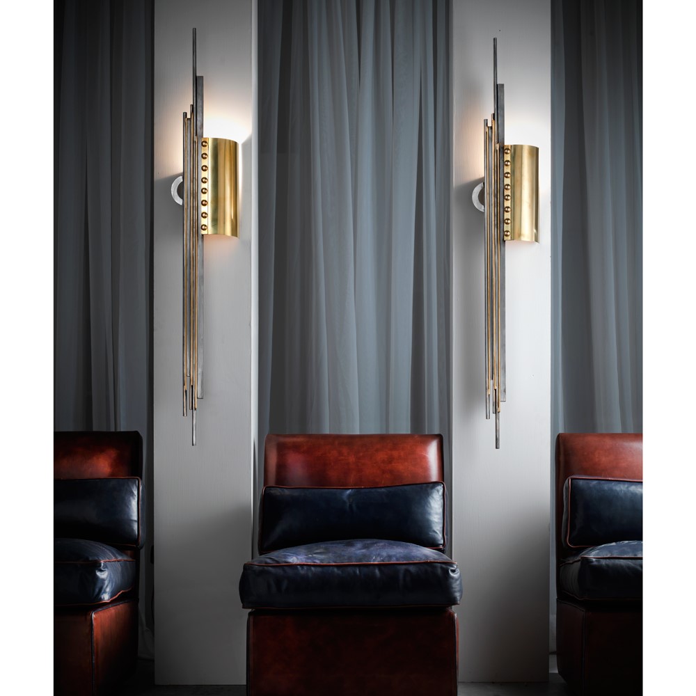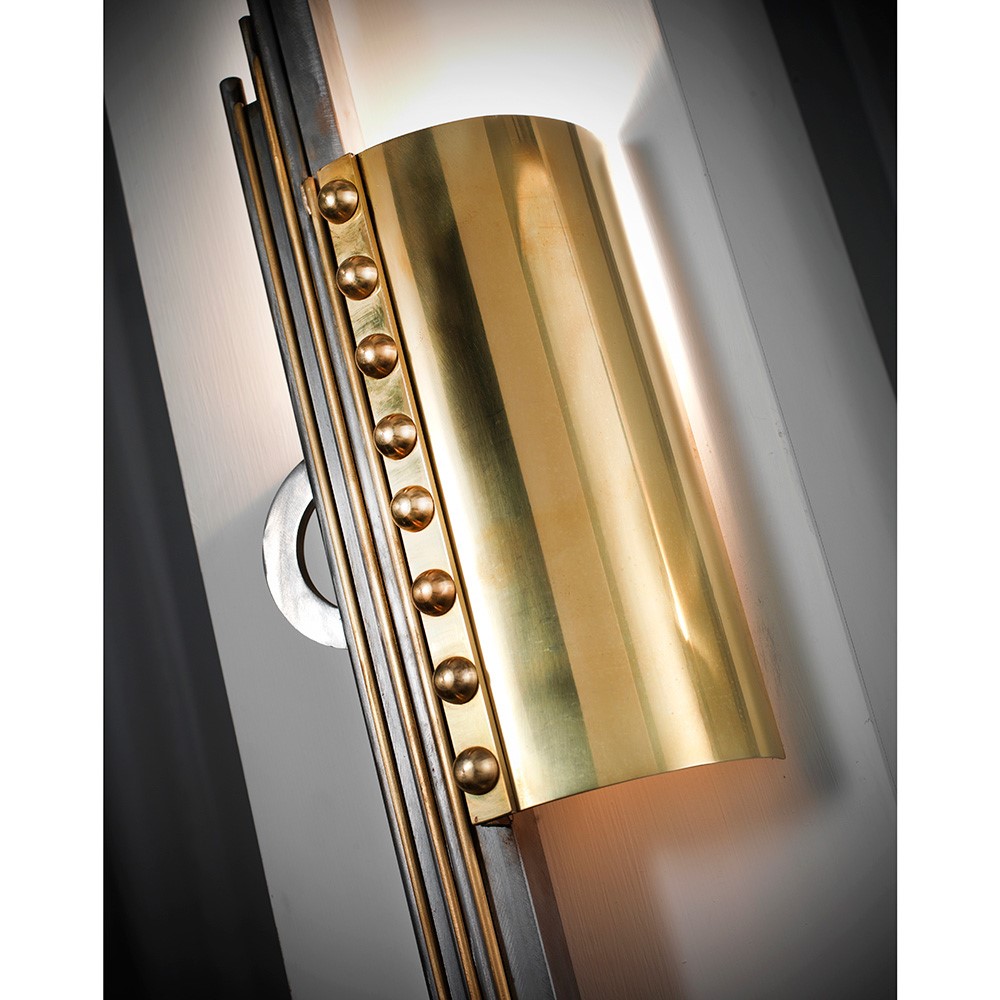 Wall lamp composed by hand welded, emery metal and natural brass details.