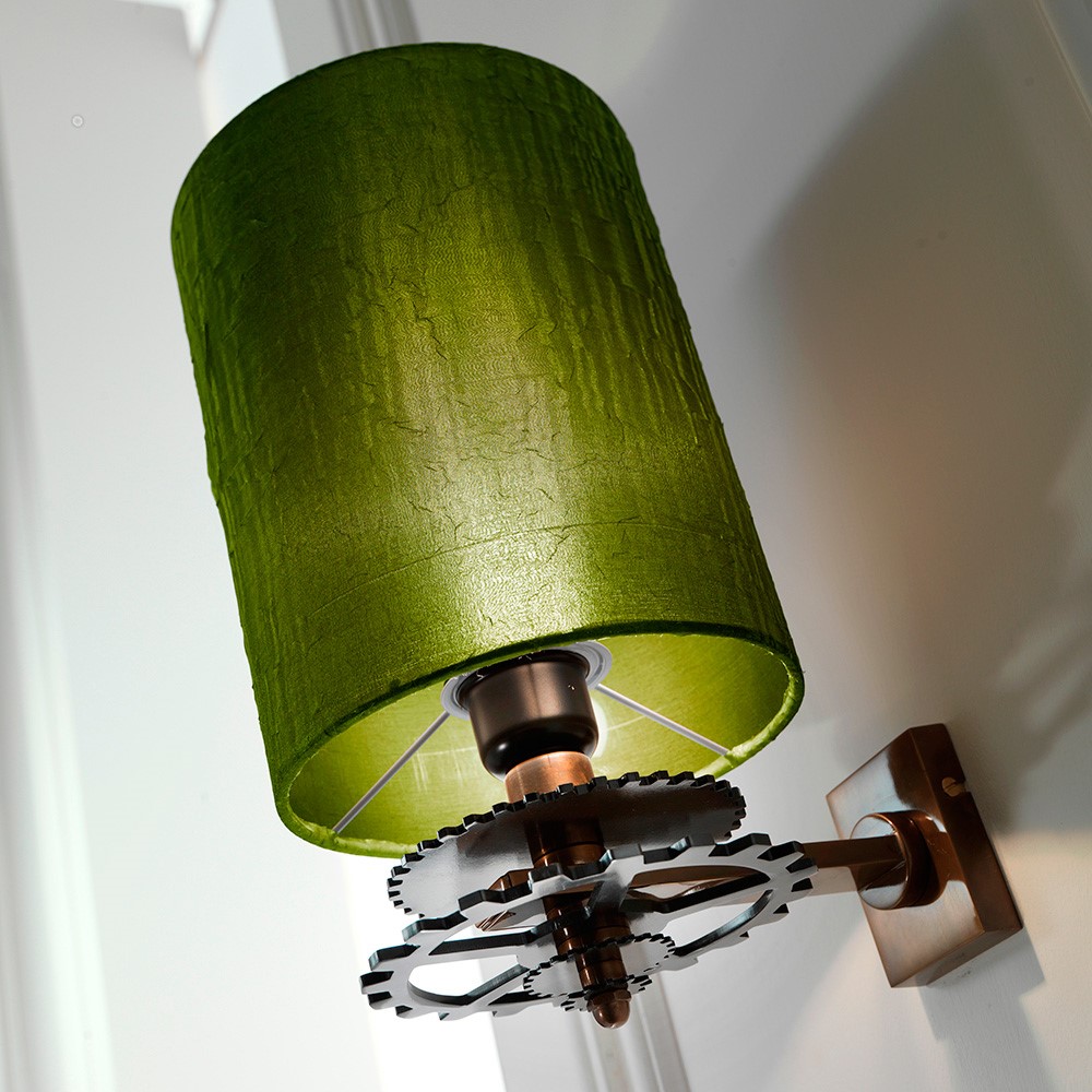 Burnished brass wall lamp with iron gearwheels in pewter finish. Green “lux” silk over green silk double lampshade.