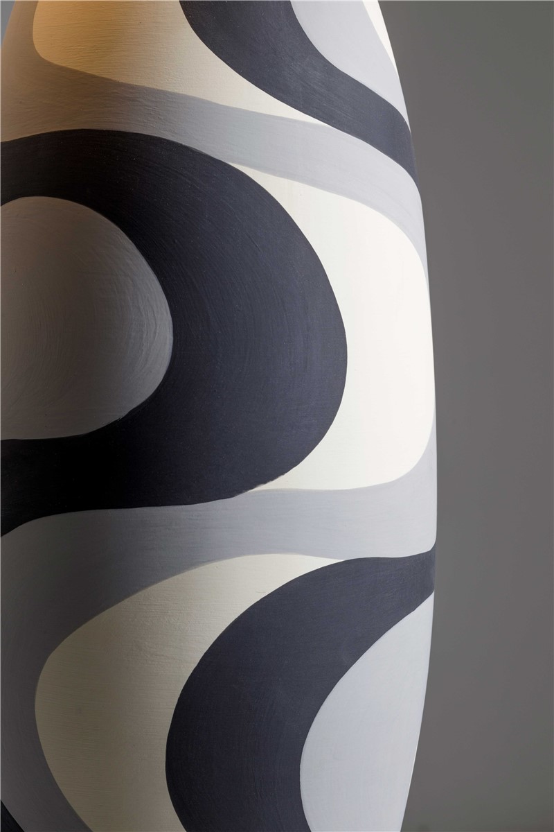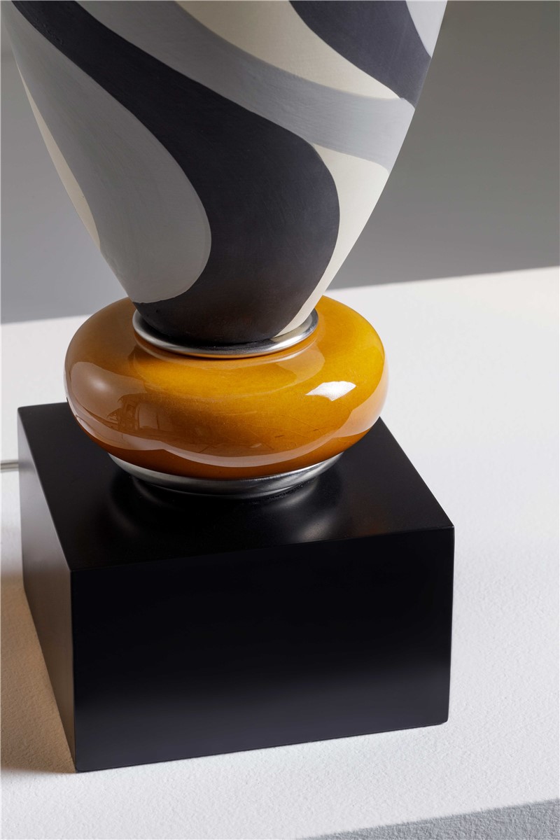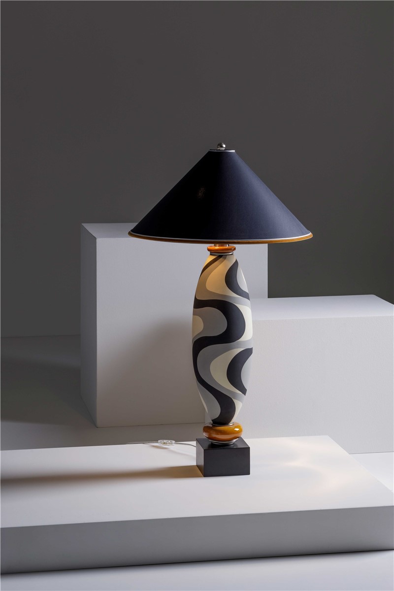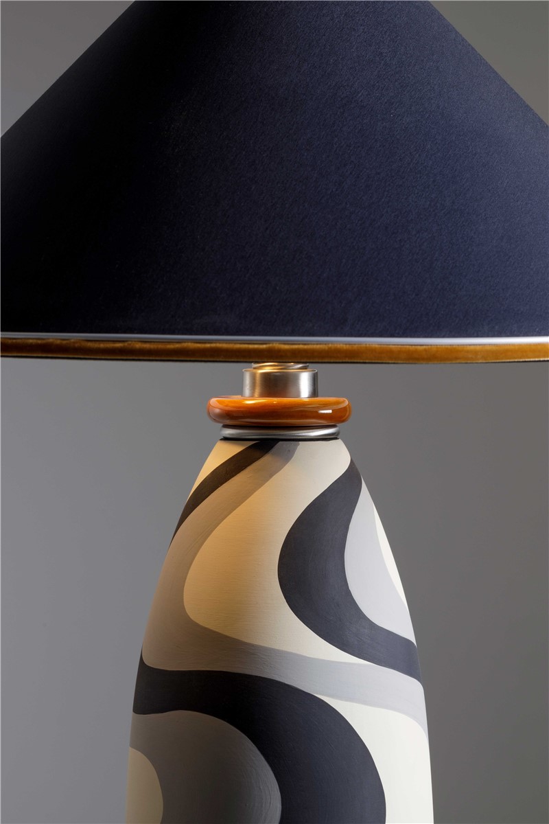 Table lamp majolica hand decorated and details in amber and nickel brass. Lamp shade in black inside silver