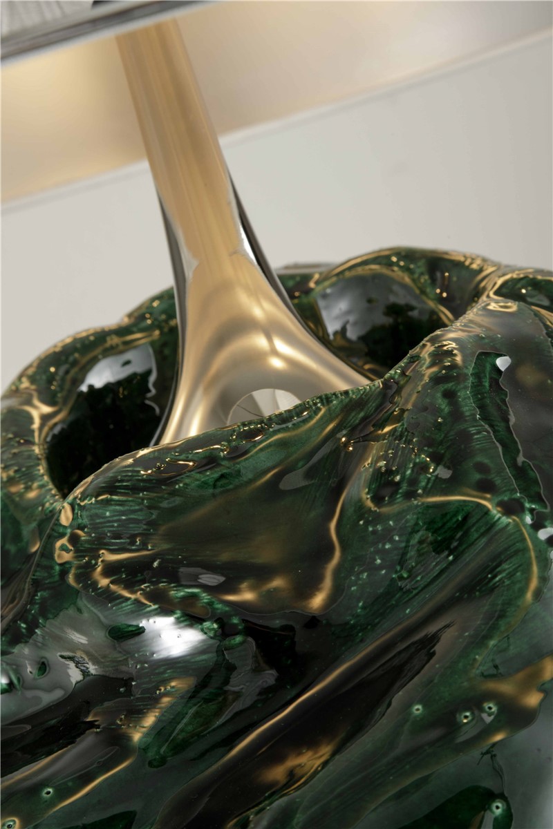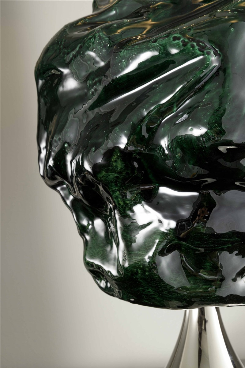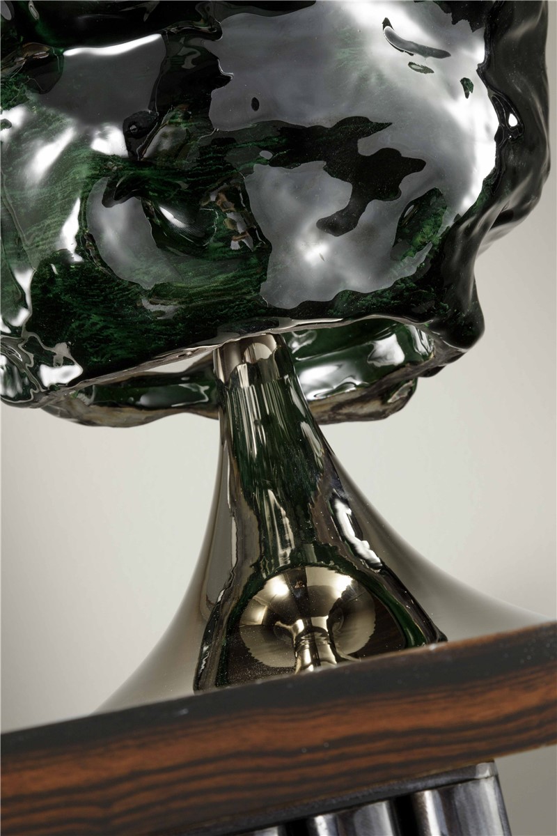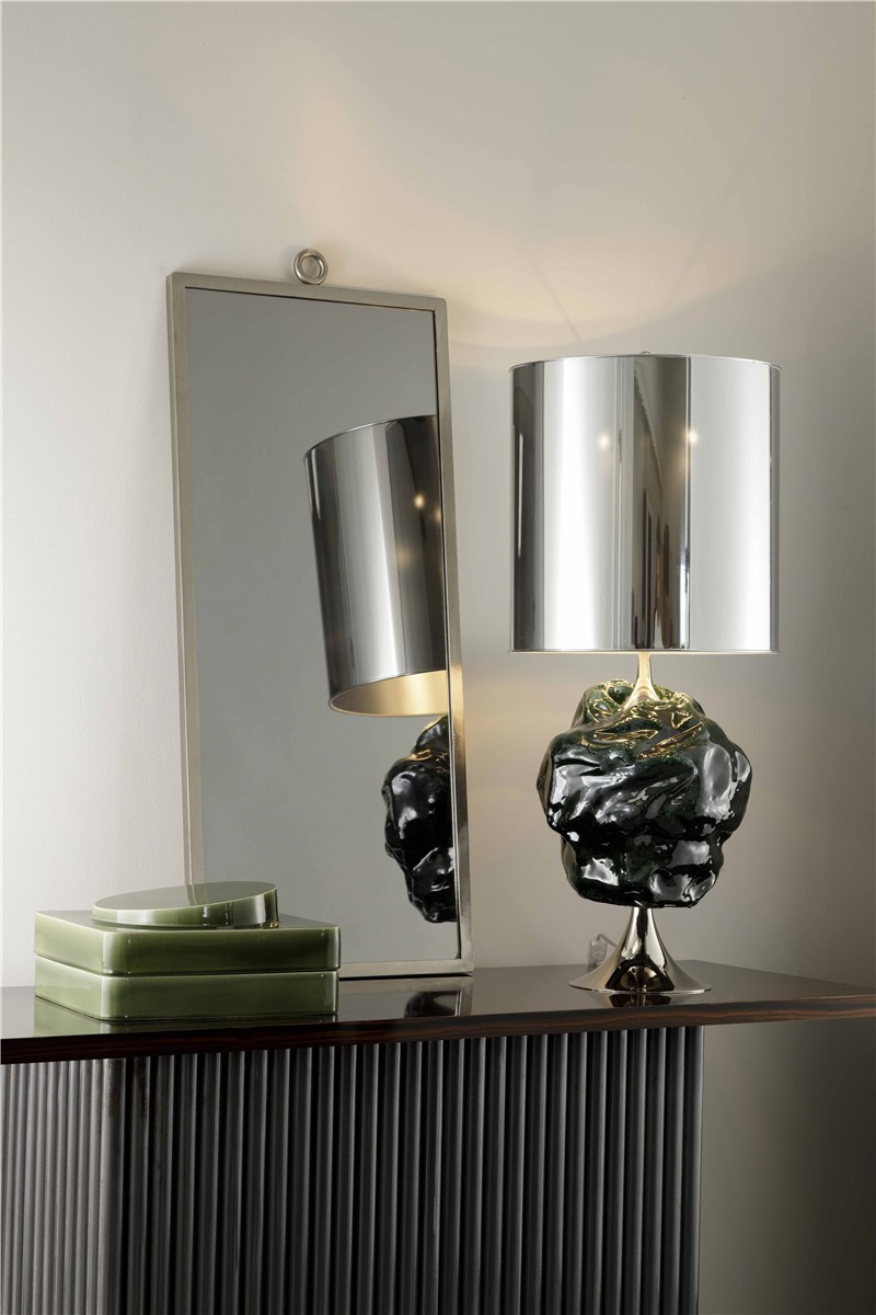 Dark green enamel enameled refractory clay lamp with bronze mergers in Nikel. The lampshade is in silver polycarbonate