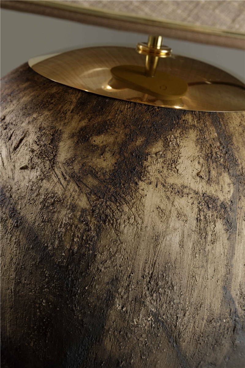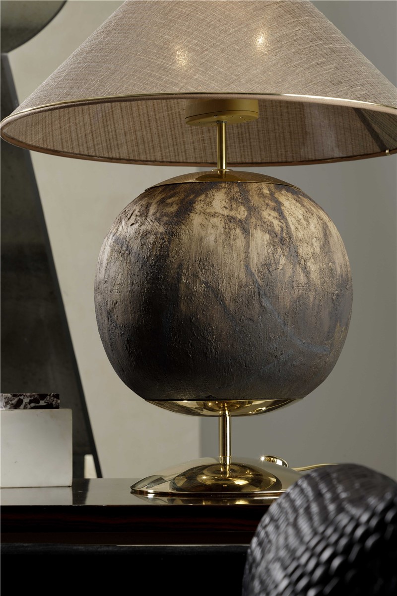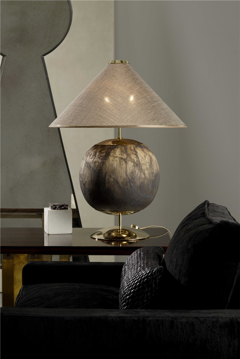 Lamp made in fireclay ceramic with details in gilded brass, silk lampshade