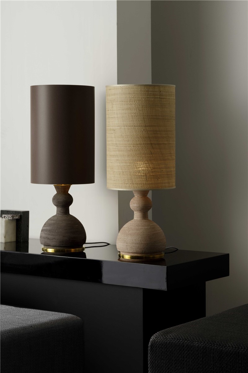 Table lamp in dark clay ceramic with details in natural brass. The lampshade is in brown chintz inside gold