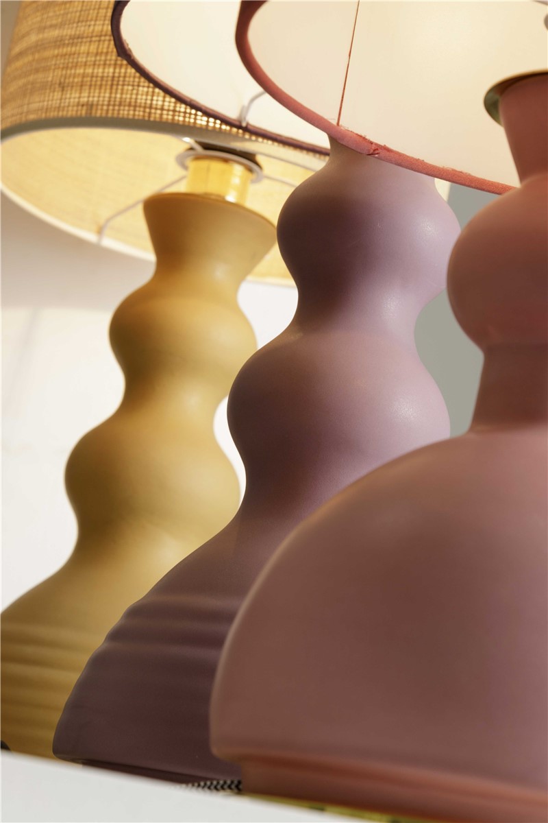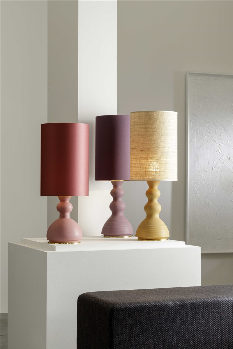 Table lamp in matt satin mauve enamelled majolica with natural brass. The lampshade is in purple satin