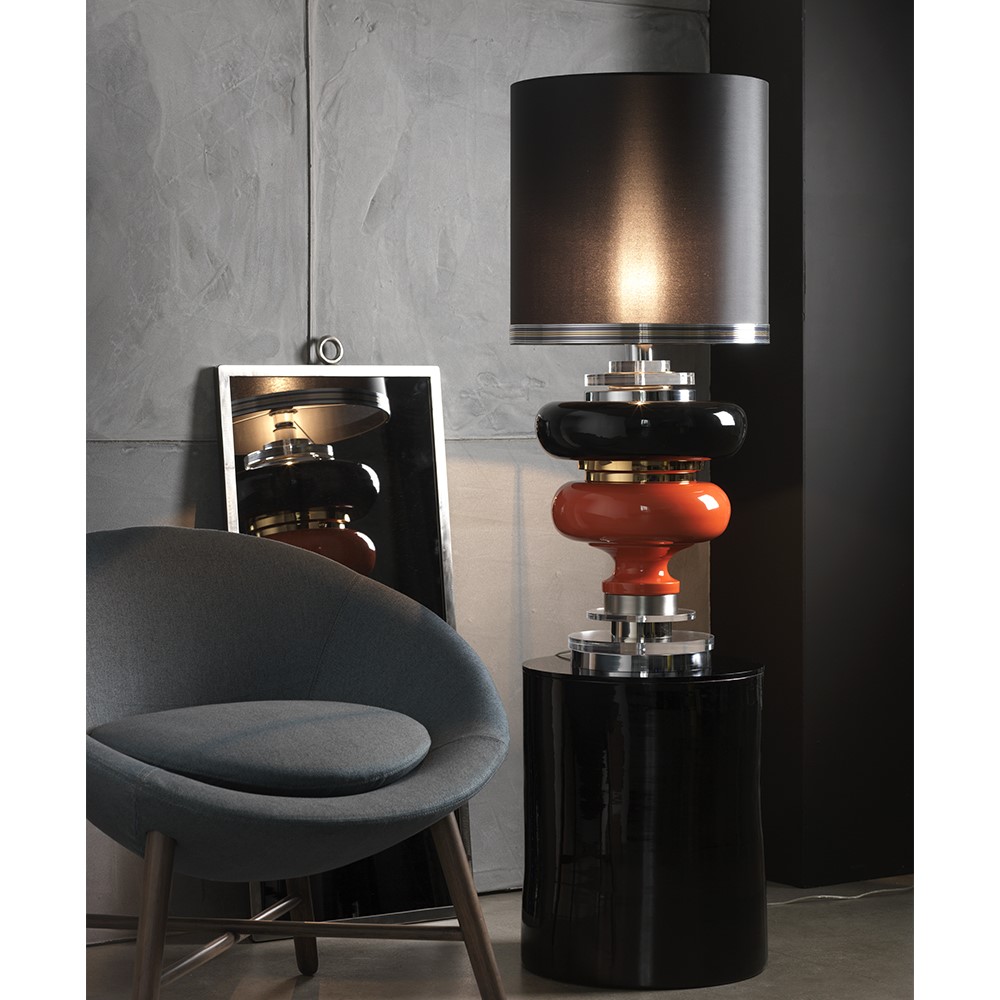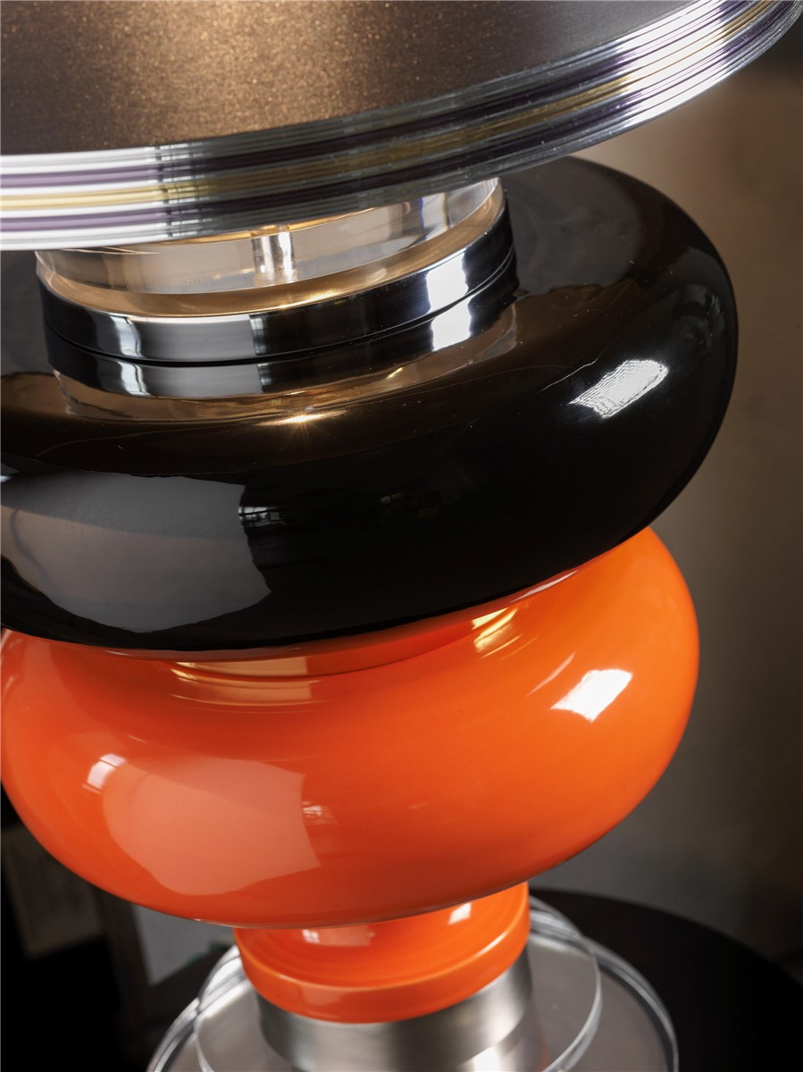 Lamp composed in majolica glazed in black and orange, nickel and gold- plated brass. Lampshade is black silk.