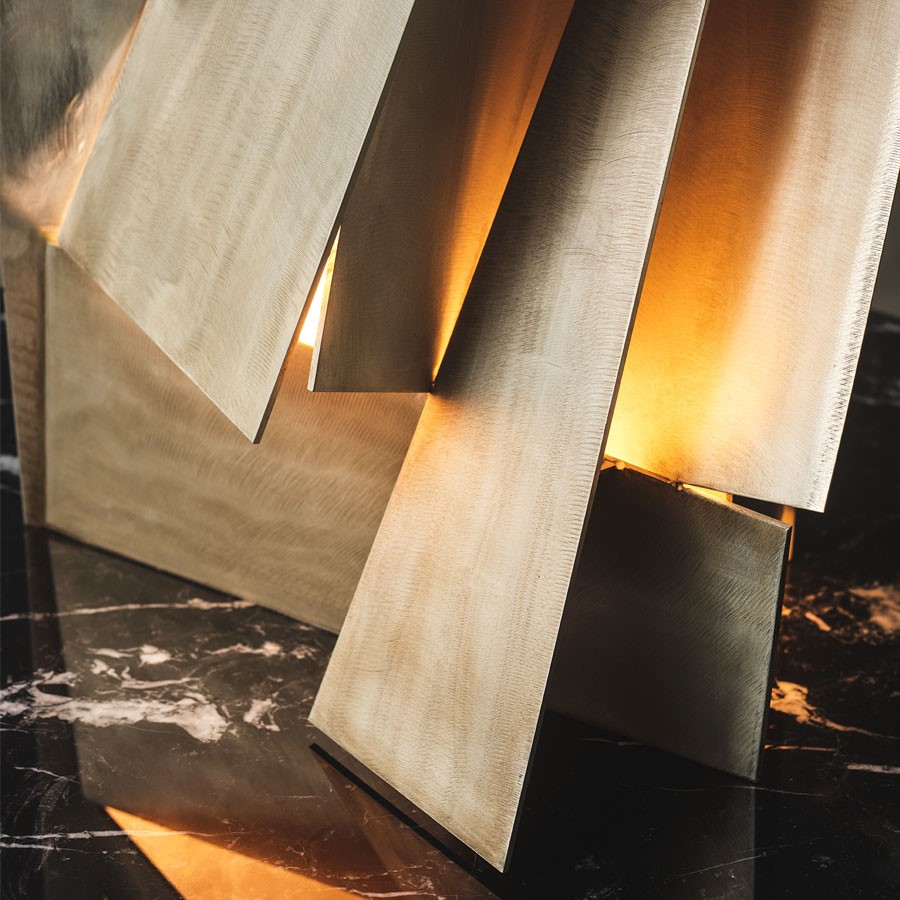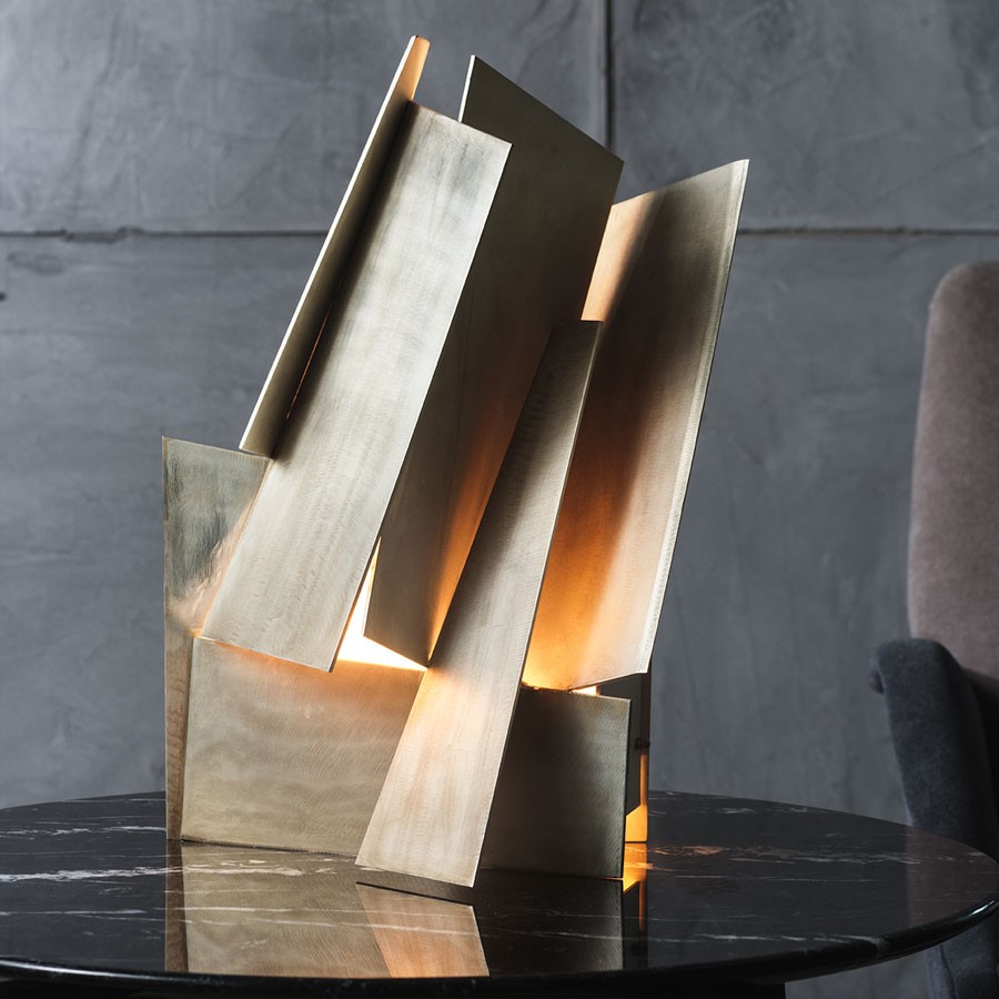 Table lamp entirely composed of frosted brass sheets, engraved and finely welded one by one by the skilled hands of our craftsman. The finish is plated in brushed and aged silver. The peculiarity of this table lamp is that it's presented as a sculpture, an illuminated sculpture. Uniqueness and refinement are adjectives for this lamp, suitable for both contemporary but also classic environments to create stylistic contrasts but always in refinement.