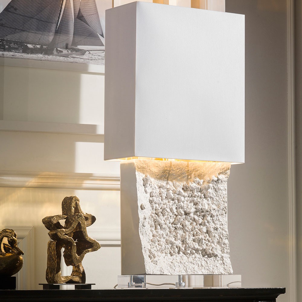 Lamp in majolica hand engraved with plexiglass base with white shade inside gold.