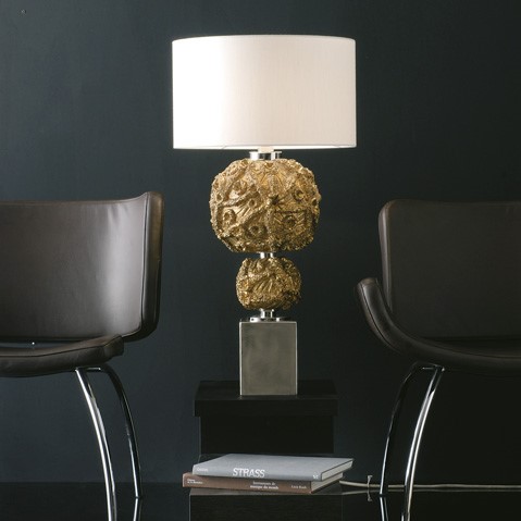Lamp in hand engraved and gold plated majolica. Chromed brass details and chromed, brushed iron base. White taffeta lampshade.