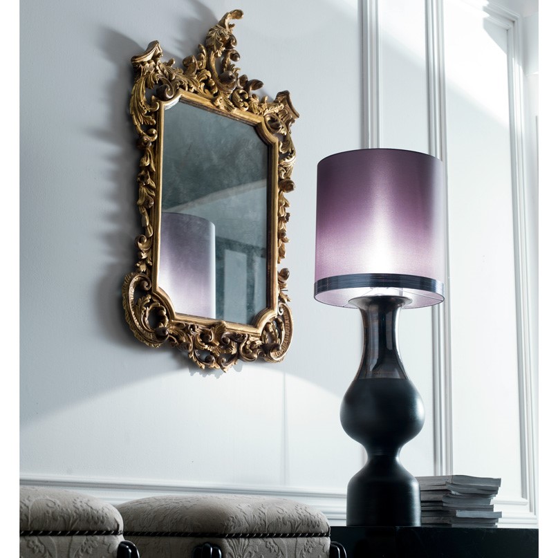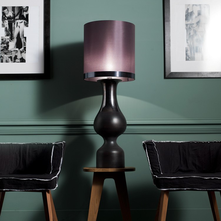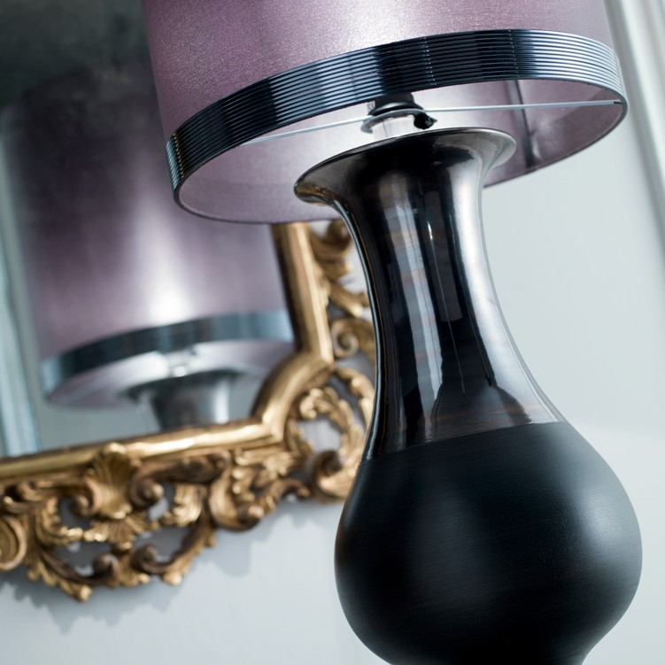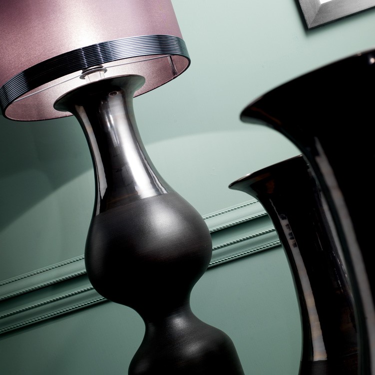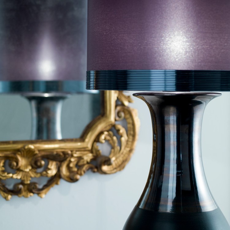 Lamp in hand turned majolica, dark chocolate brown glazed, aged fumé metal plated. Grey silk lampshade; also available in aged gold version CL2006/O or aged platinum version CL2006/AR.