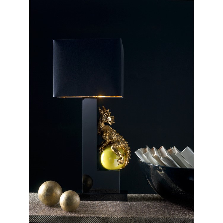Lamp with glossy-black lacquered wooden structure. Hand engraved and glazed majolica dragon, slightly aged gold plated. Black chintz lampshade with golden inside.