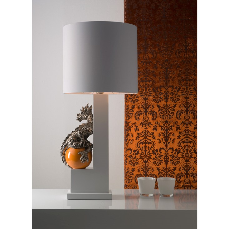 Lamp with glossy-white lacquered wooden structure. Hand engraved and glazed majolica dragon, slightly aged platinum plated. White chintz lampshade with silver inside.