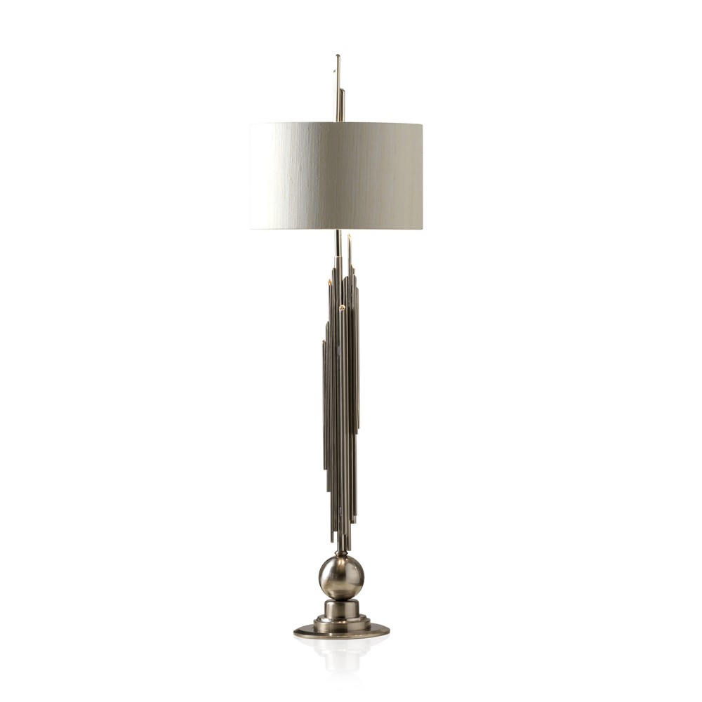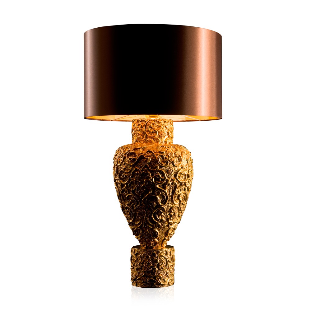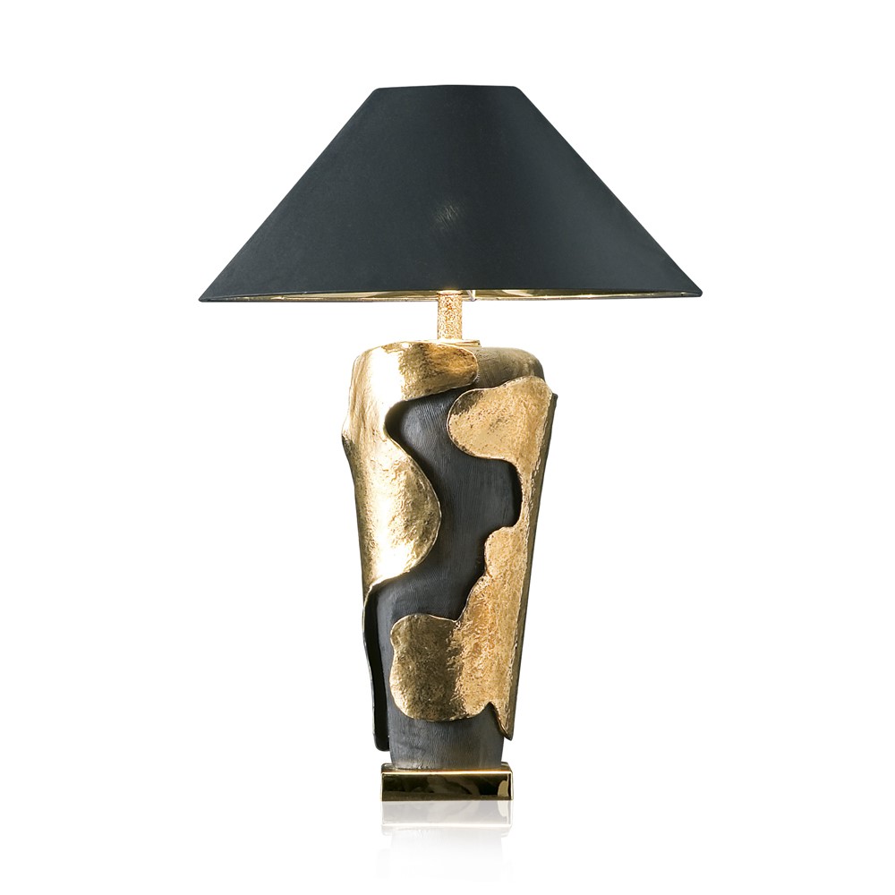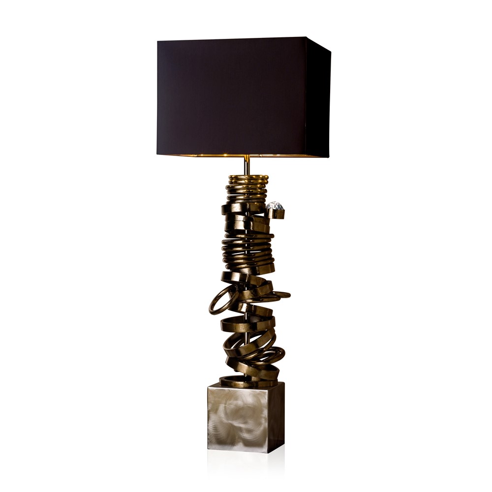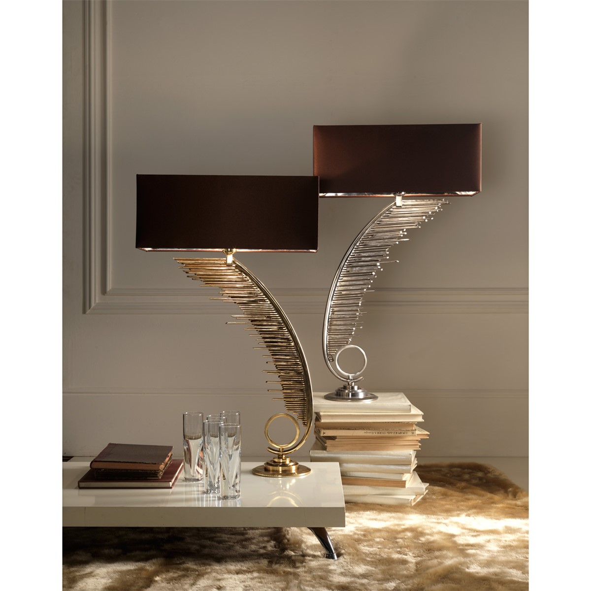 Lamp made of iron tubes, hand soldered and cut, gold plated or chromed. Brown silk satin lampshade with golden or silver inside.
