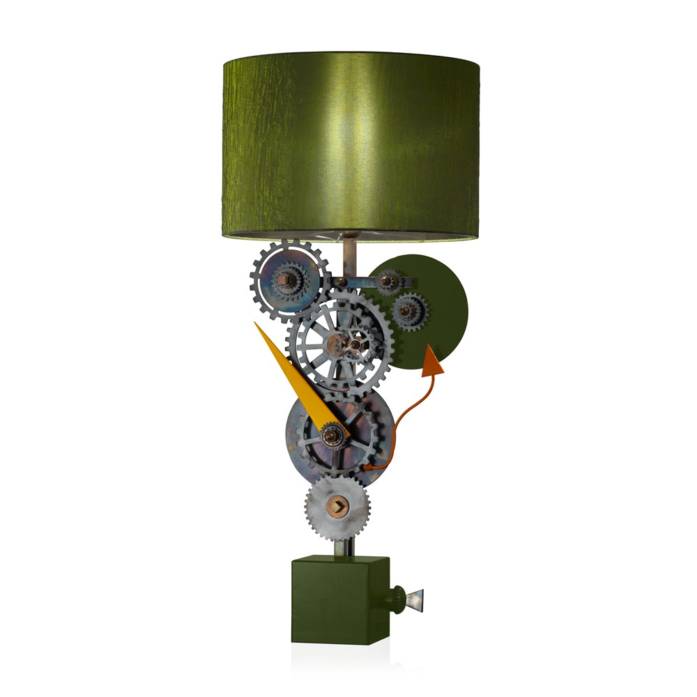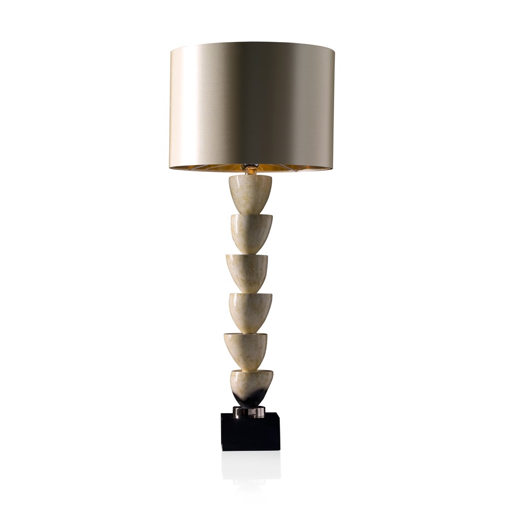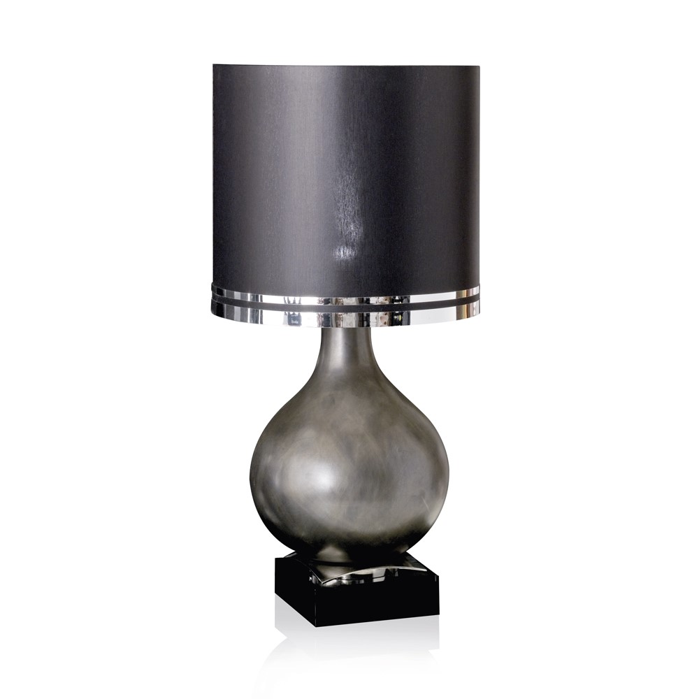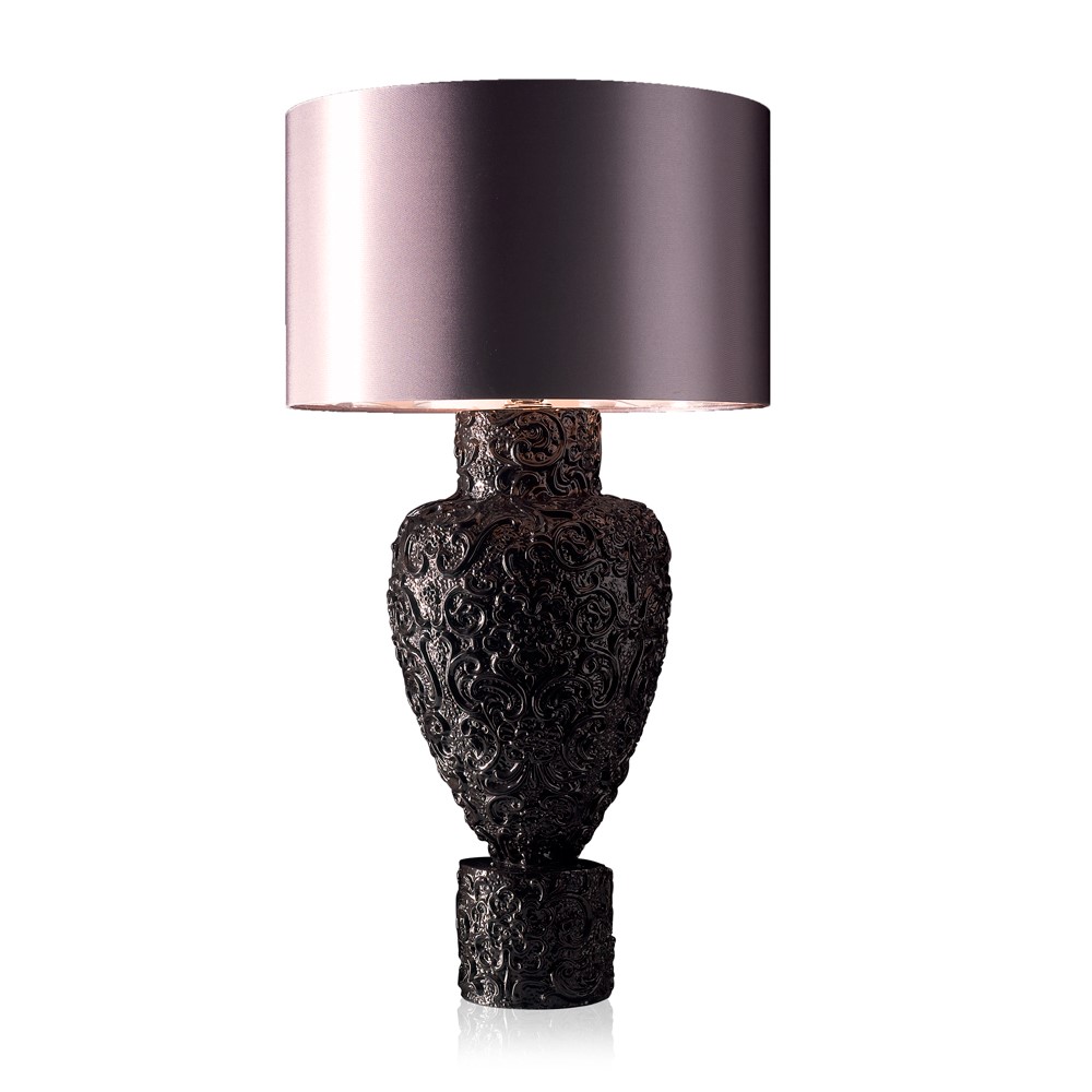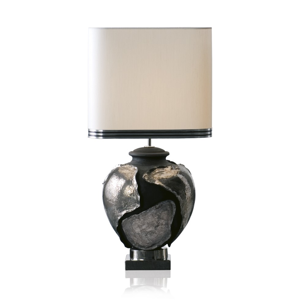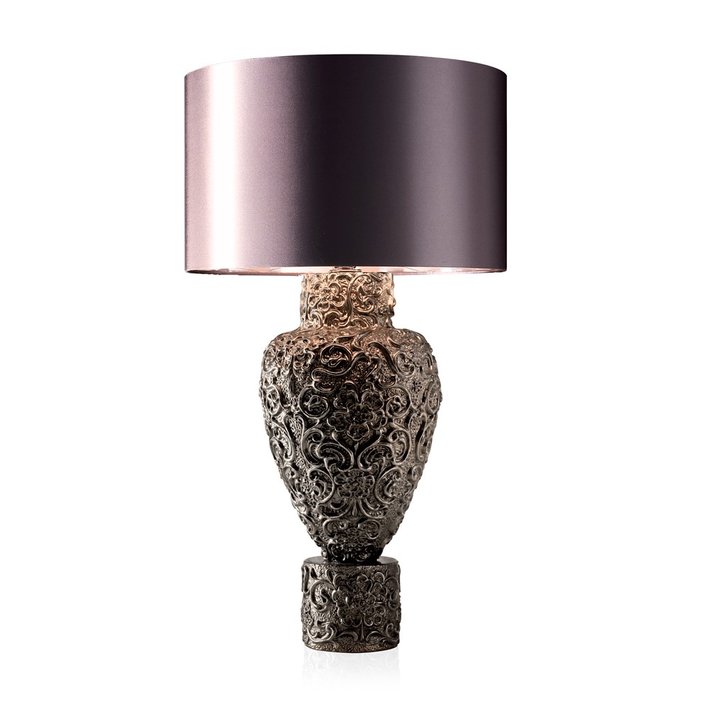 Lamp made of iron tubes, hand soldered and cut, gold plated or chromed. Brown silk satin lampshade with golden or silver inside.