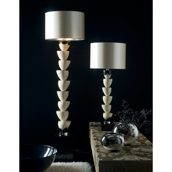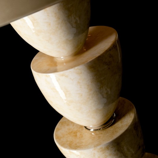 Table lamp with hand turned and glazed majolica shaft. Glossy-black lacquered wooden base with chromed brass details. Ivory satin lampshade with golden inside.