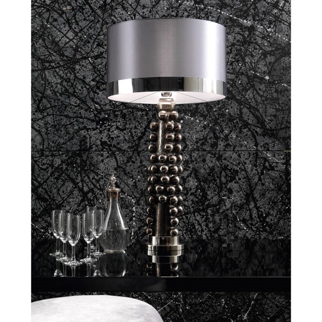 Lamp with platinum plated, hand engraved majolica shaft. Chromed brass base and details. Grey silk satin lampshade with silver band; when on, the shade colour is mauve.