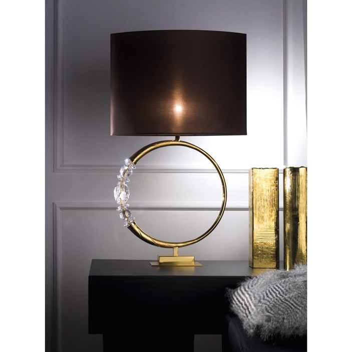 Golden brass lamp with hand cut crystal details and crystal made by Swarovski® Elements. Brown taffeta lampshade.